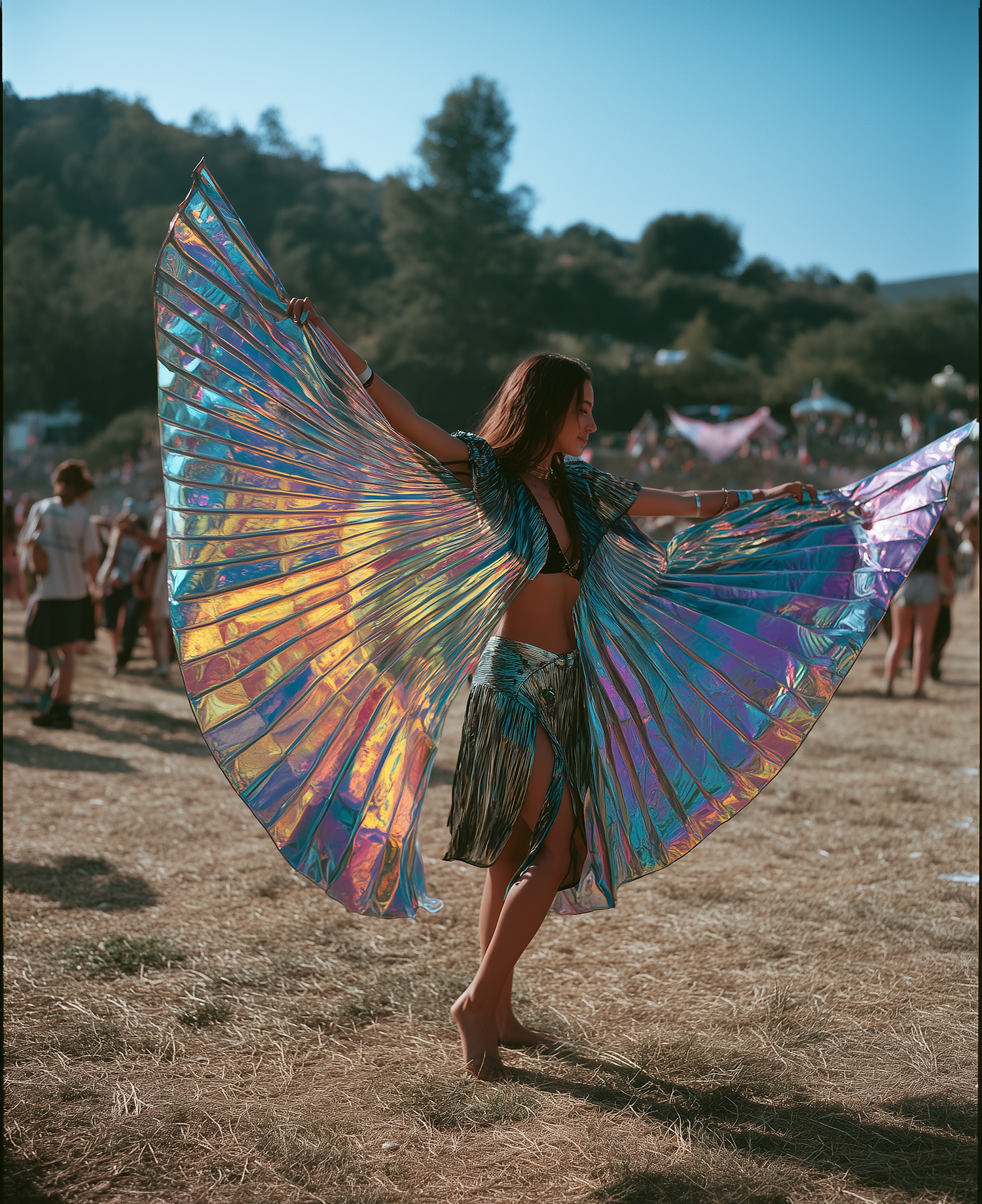A woman dances in a vibrant, iridescent costume at an outdoor festival, surrounded by a lively crowd and a sunny, natural setting.