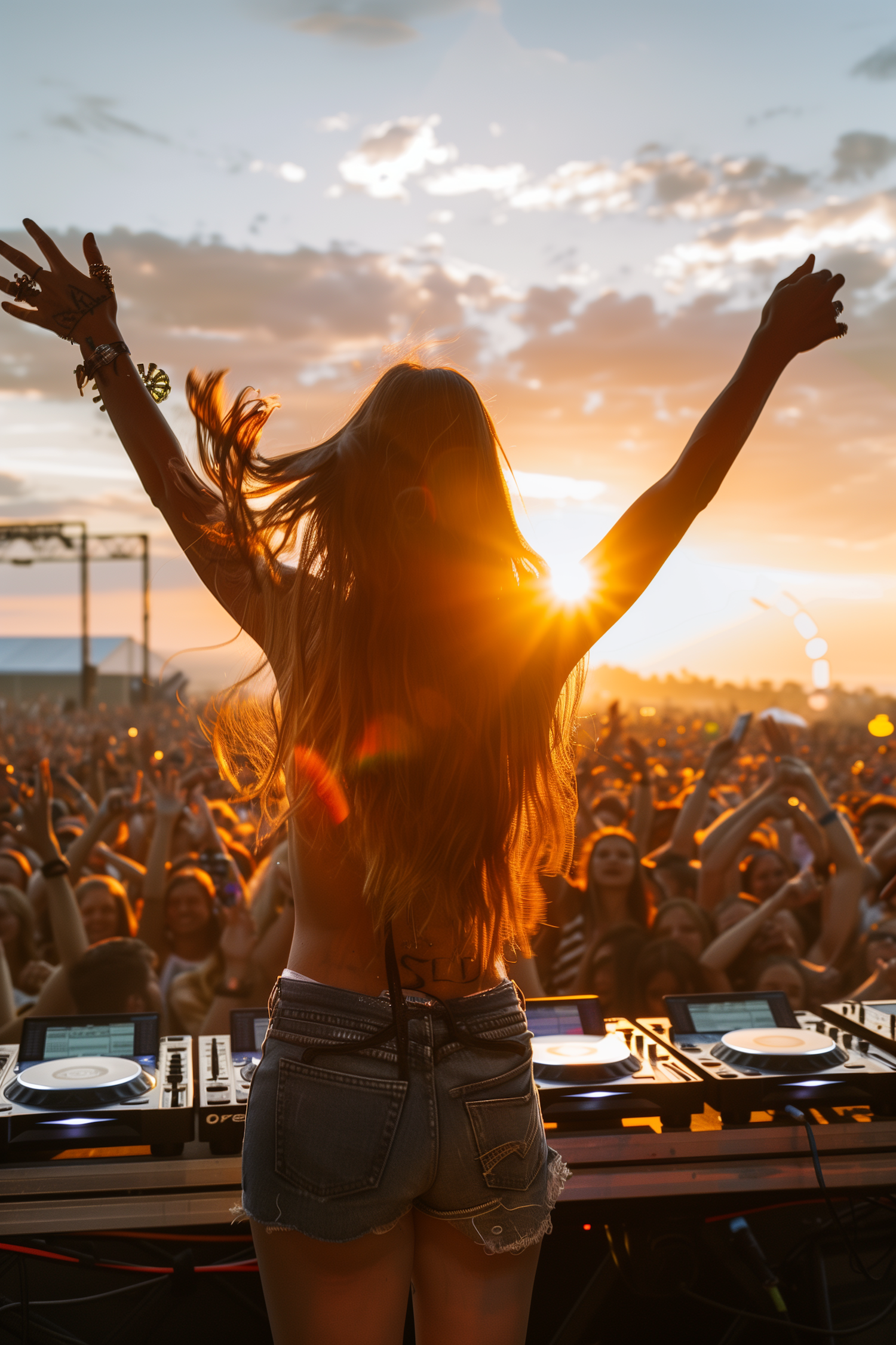 DJ on stage at sunset with a lively crowd, capturing the vibrant energy of a music festival.