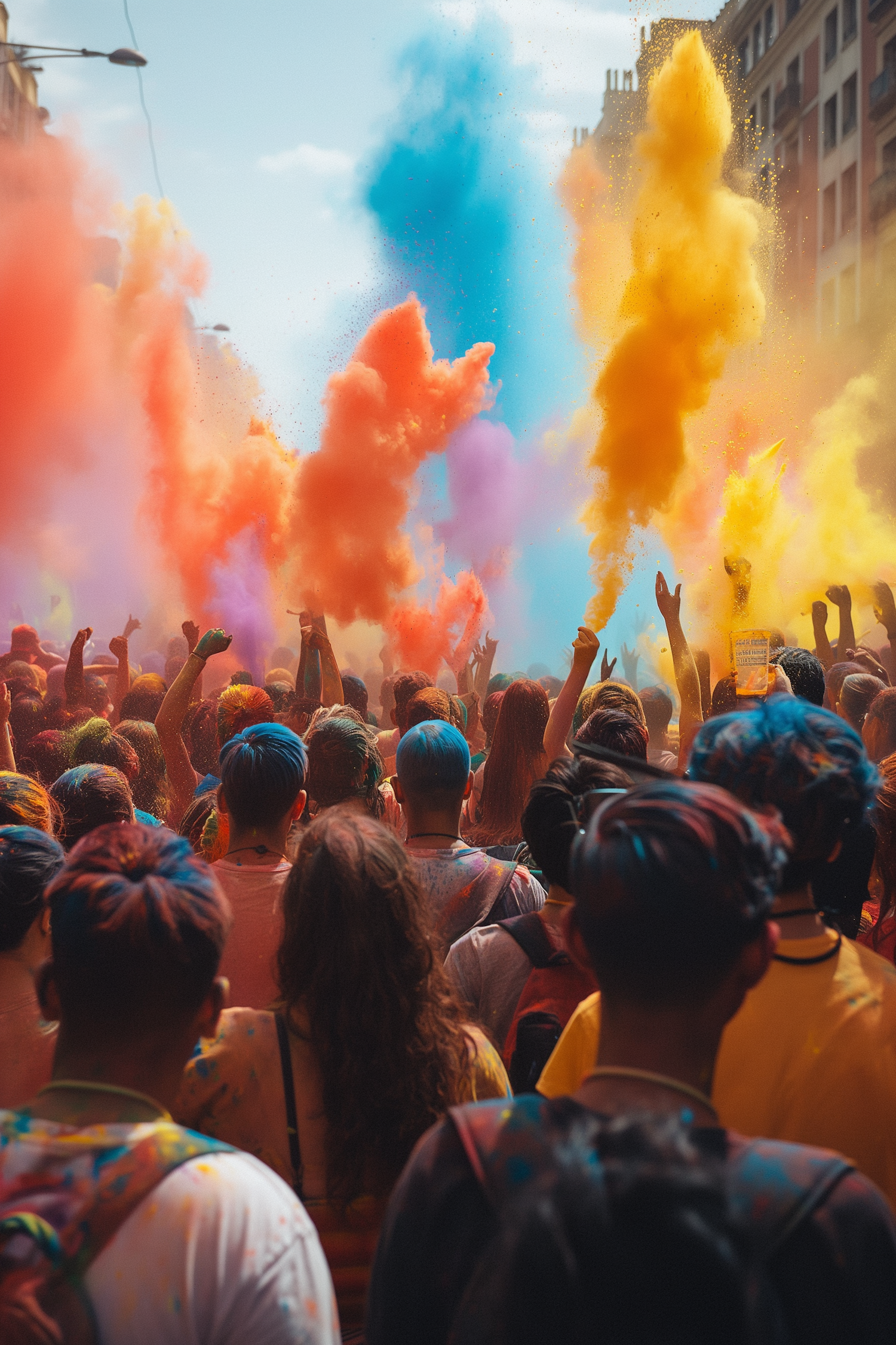Vibrant festival scene with a diverse crowd celebrating with colorful powders in an urban setting.