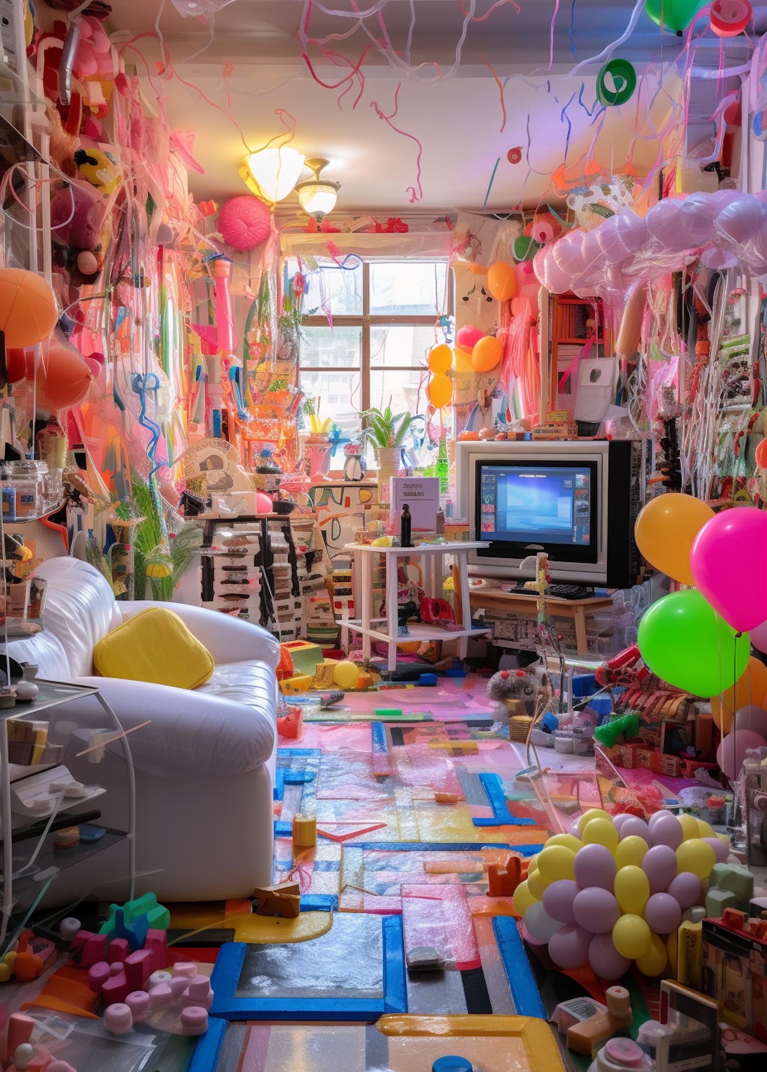 A colorful, chaotic room filled with balloons, streamers, and a vintage TV, creating a vibrant and festive atmosphere.