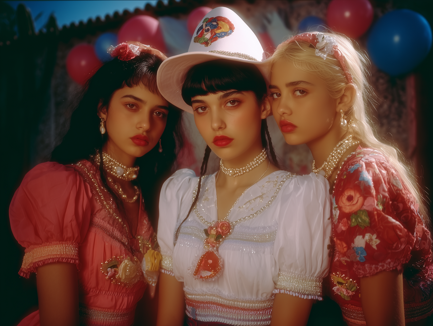 Three women in vibrant traditional dresses and accessories pose together in a festive setting with colorful balloons in the background.