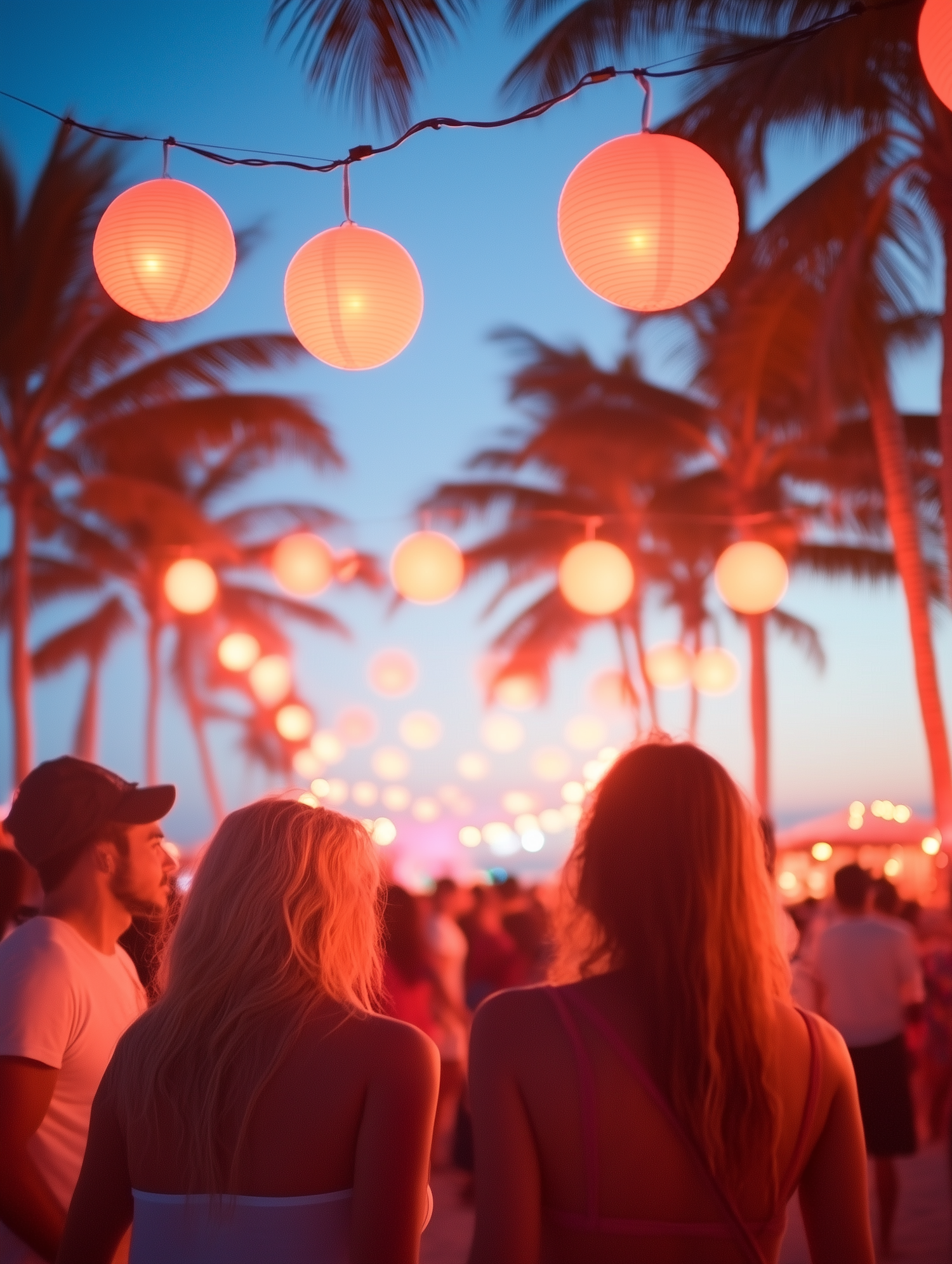 Twilight beach party with glowing lanterns, palm trees, and a lively crowd enjoying the festive atmosphere.