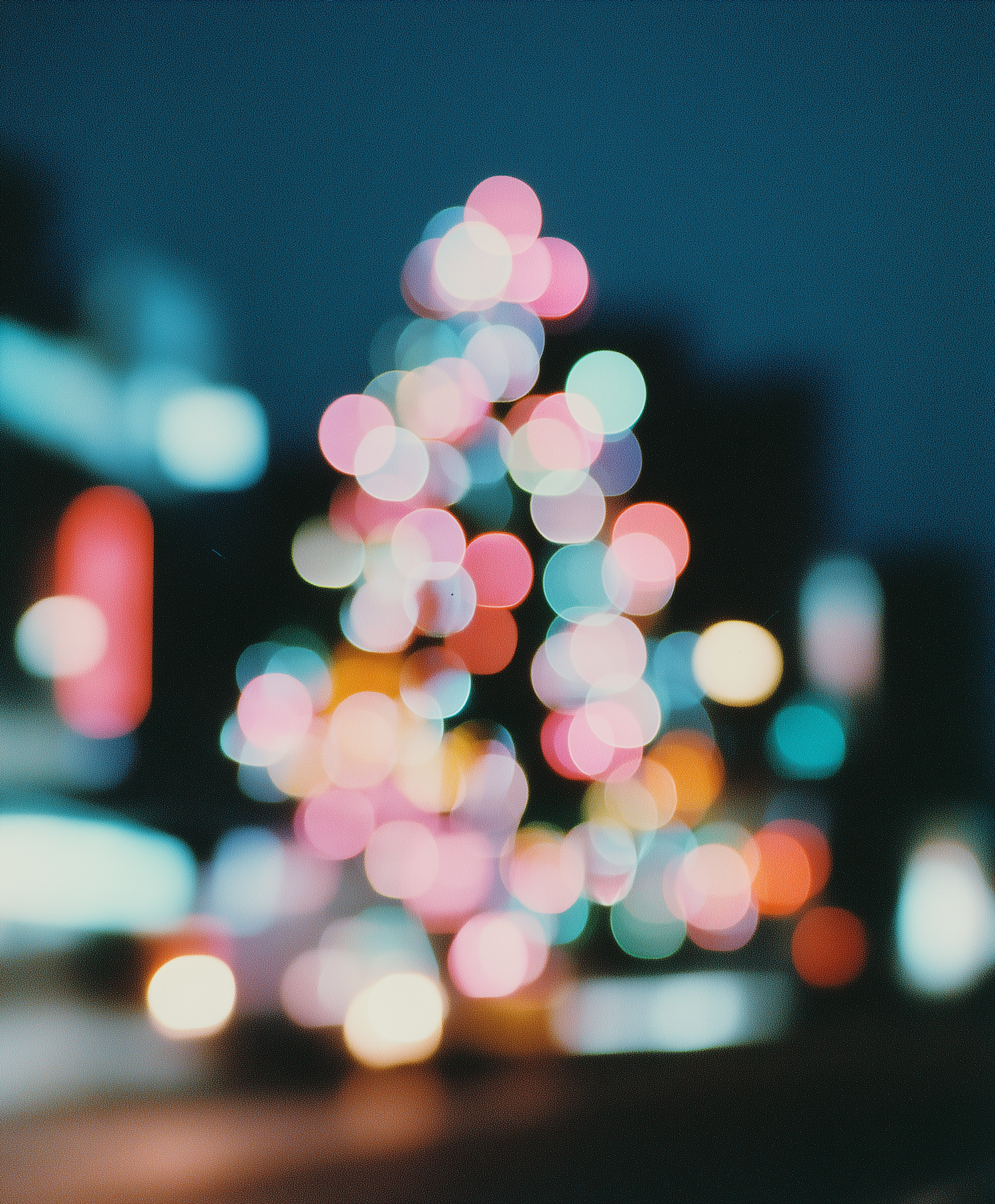 A dreamy bokeh image of colorful lights forming a triangular shape, resembling a festive tree, against a dark urban background.