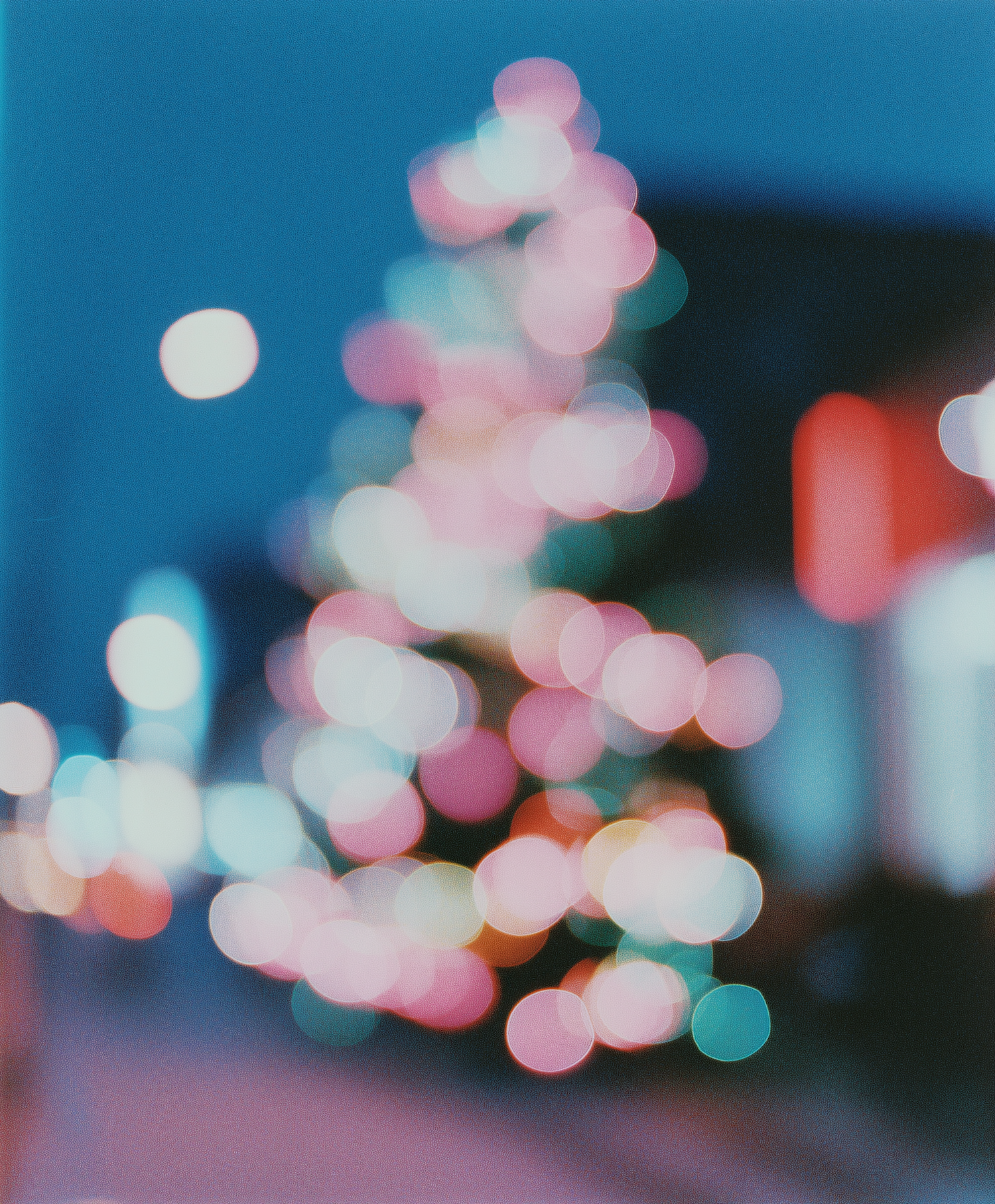 A blurred Christmas tree with colorful bokeh lights in a dreamy, festive setting.