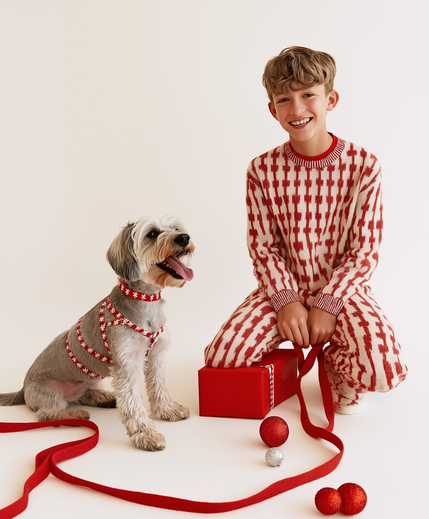 A cheerful boy in festive pajamas sits with his dog, surrounded by Christmas ornaments and a gift box, creating a joyful holiday scene.