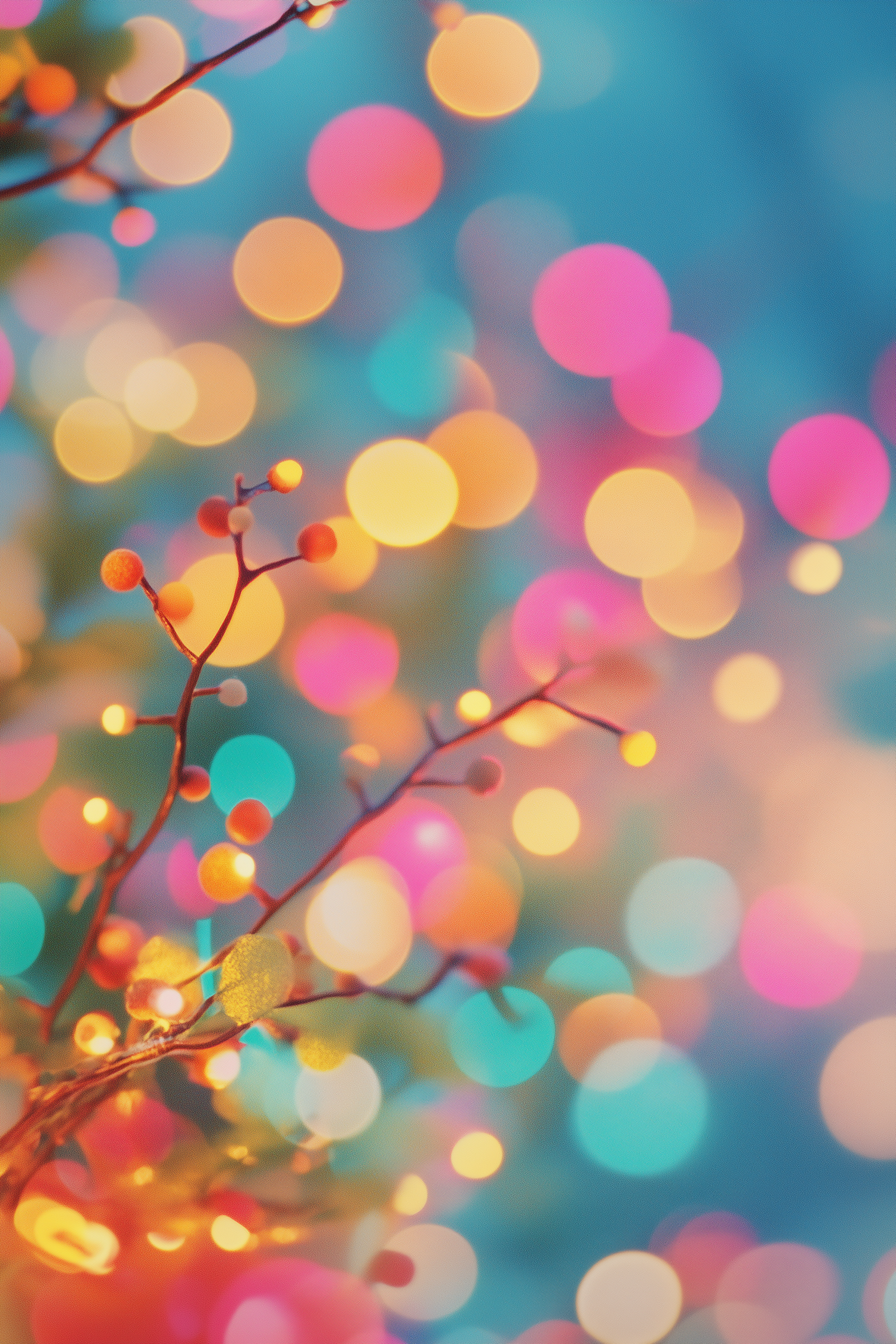 Colorful bokeh lights and glowing orbs create a dreamy, festive atmosphere with vibrant pink, blue, yellow, and orange hues.