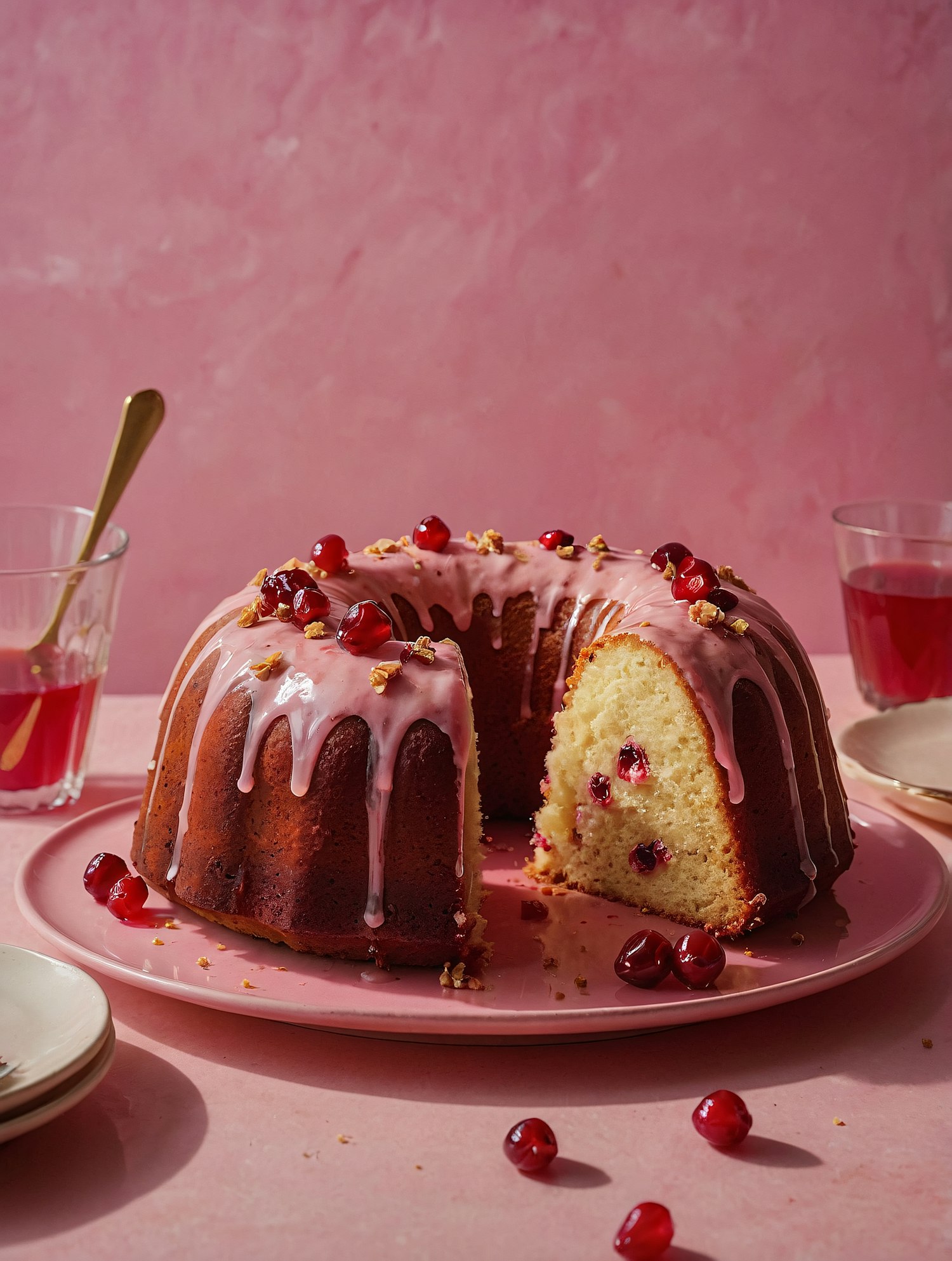 Golden bundt cake with pink glaze, cranberries, and nuts on a pink plate. A slice is cut, revealing a fluffy interior. Perfect for celebrations!