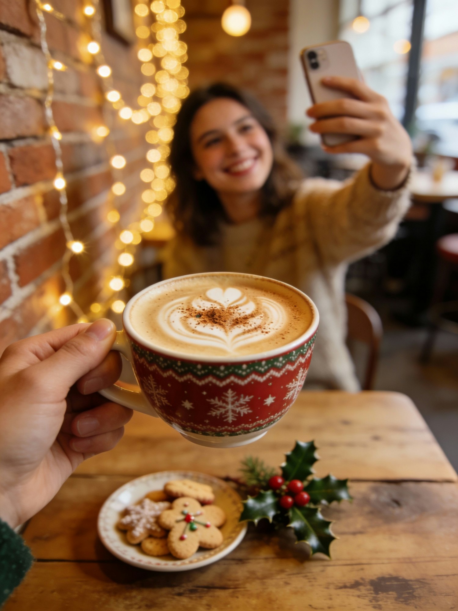 A festive café moment with a latte, gingerbread cookies, and holiday lights, featuring a cheerful woman taking a selfie.