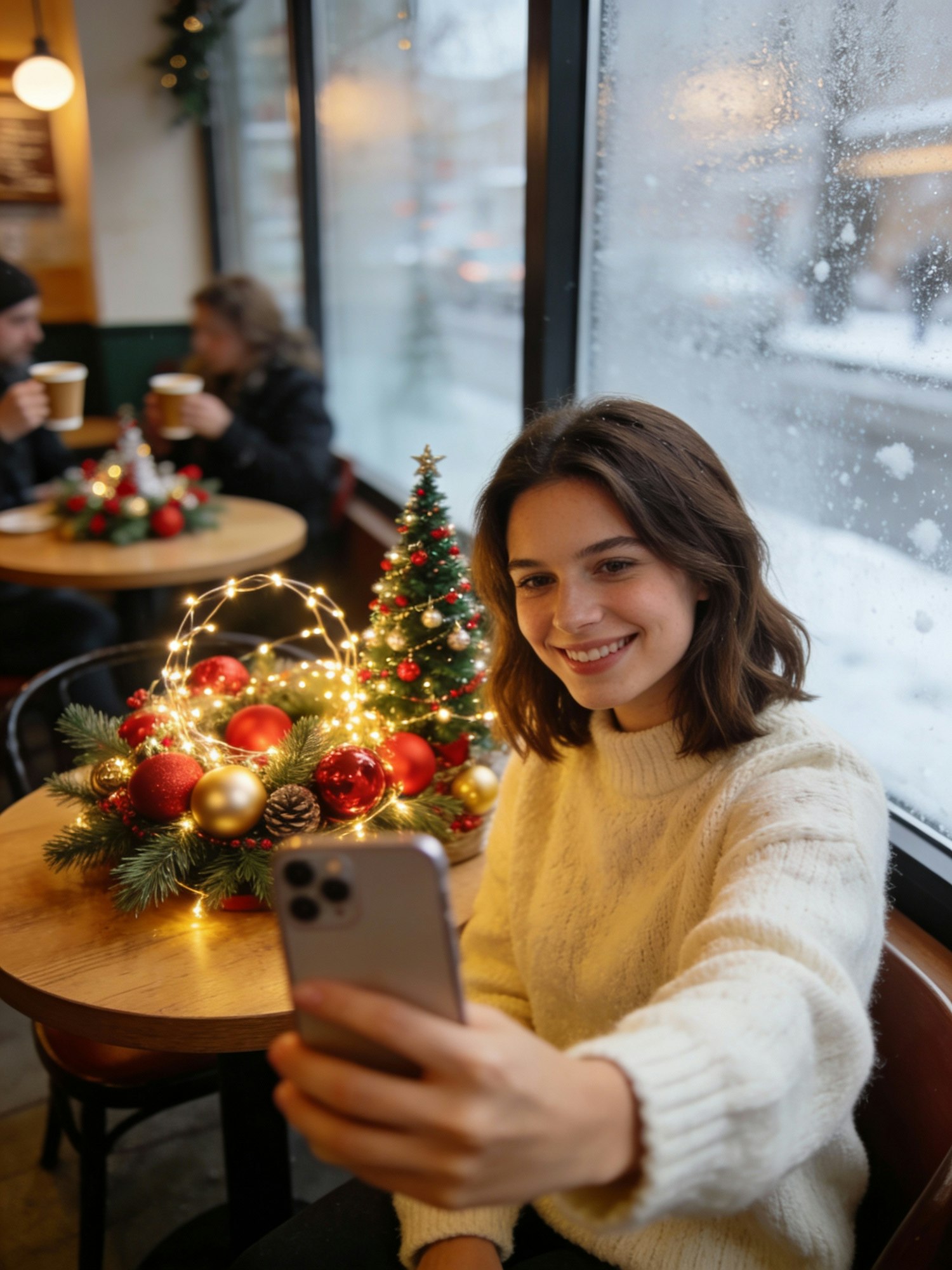 A woman in a cozy café takes a selfie with festive Christmas decorations, a small tree, and a snowy window in the background.