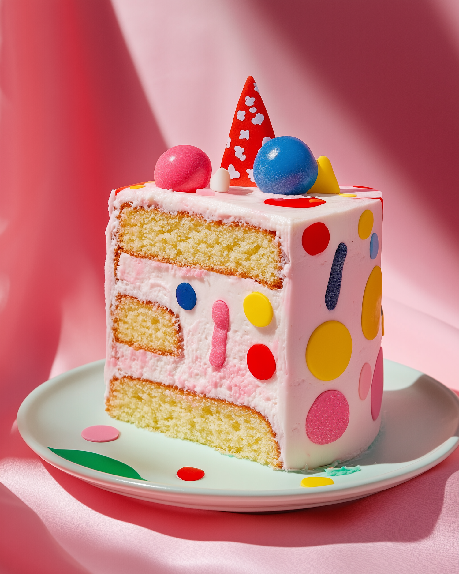Colorful slice of cake with fondant circles and party decorations on a pastel plate, set against a pink backdrop.