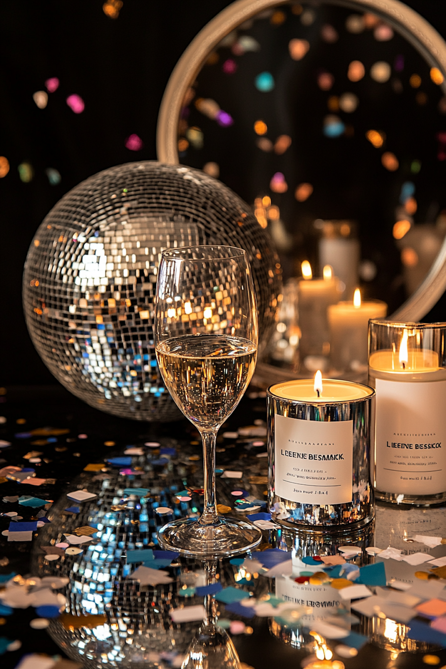 Elegant celebration setup with a glass of wine, candles, a disco ball, and colorful confetti on a reflective surface.