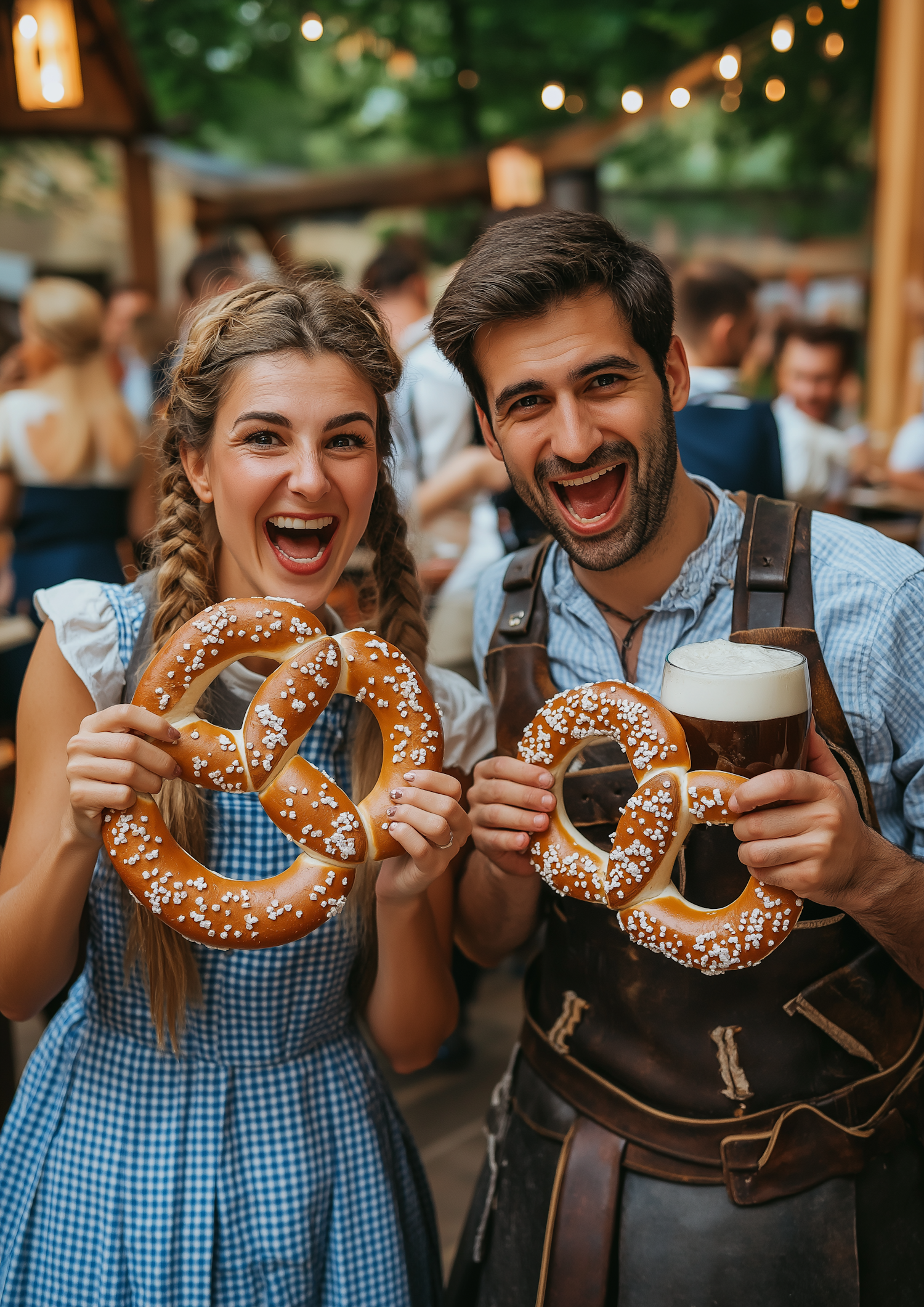 Smiling couple at a festival holding pretzels and beer, dressed in traditional attire, with festive lights in the background.