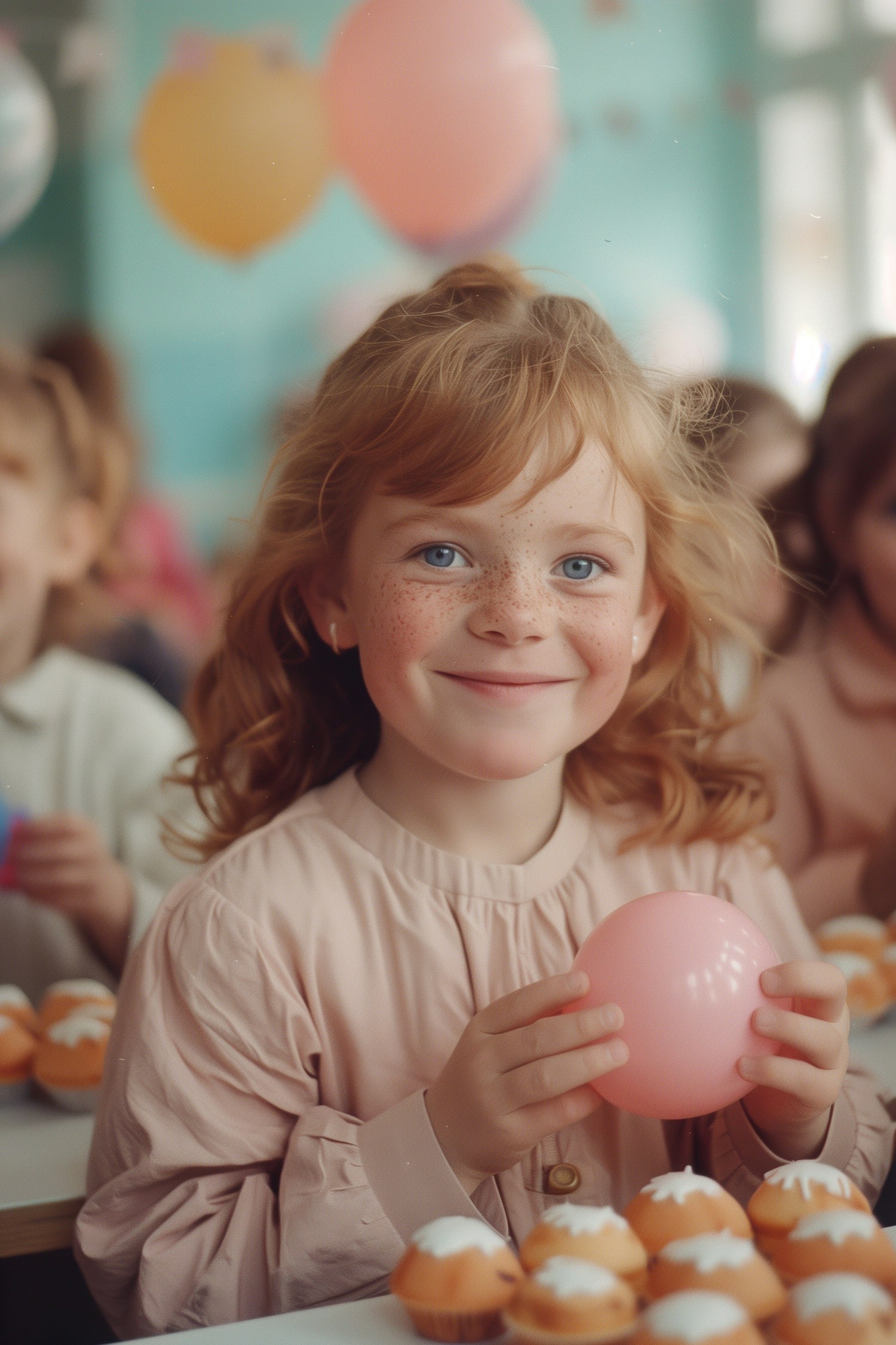 Smiling girl with freckles holds a pink balloon at a festive party, surrounded by cupcakes and colorful balloons.