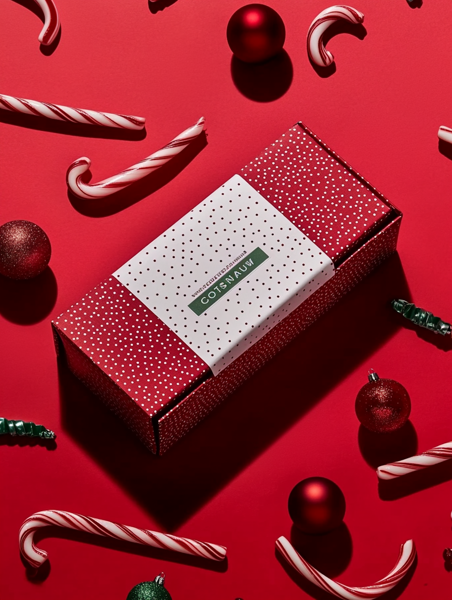 Festive gift box with polka dots surrounded by candy canes and ornaments on a red background, perfect for holiday cheer.