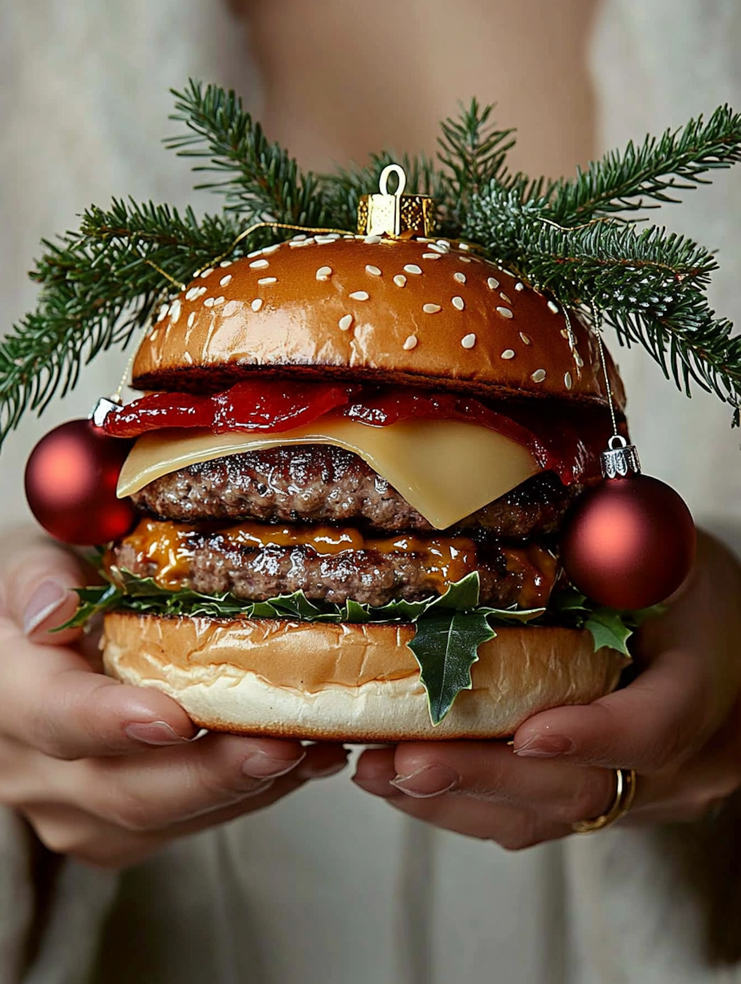 Festive burger with beef patties, cheese, and Christmas decorations, including ornaments and evergreen sprigs, held in hands.