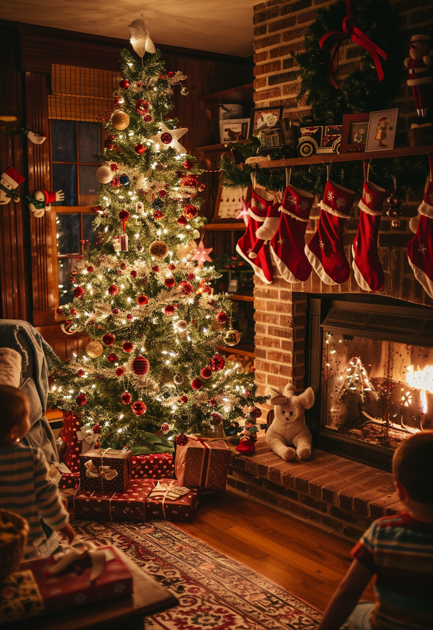 Cozy Christmas scene with a decorated tree, glowing fireplace, and children admiring gifts. Warm holiday ambiance with stockings and garlands.