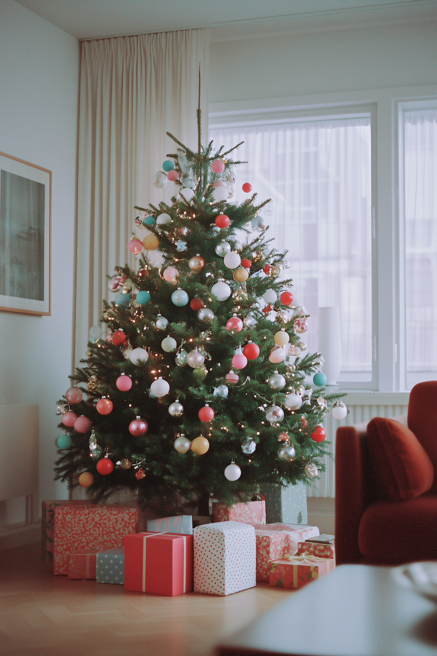 A festive Christmas tree with colorful ornaments and presents underneath, set in a cozy, modern living room with warm lighting.
