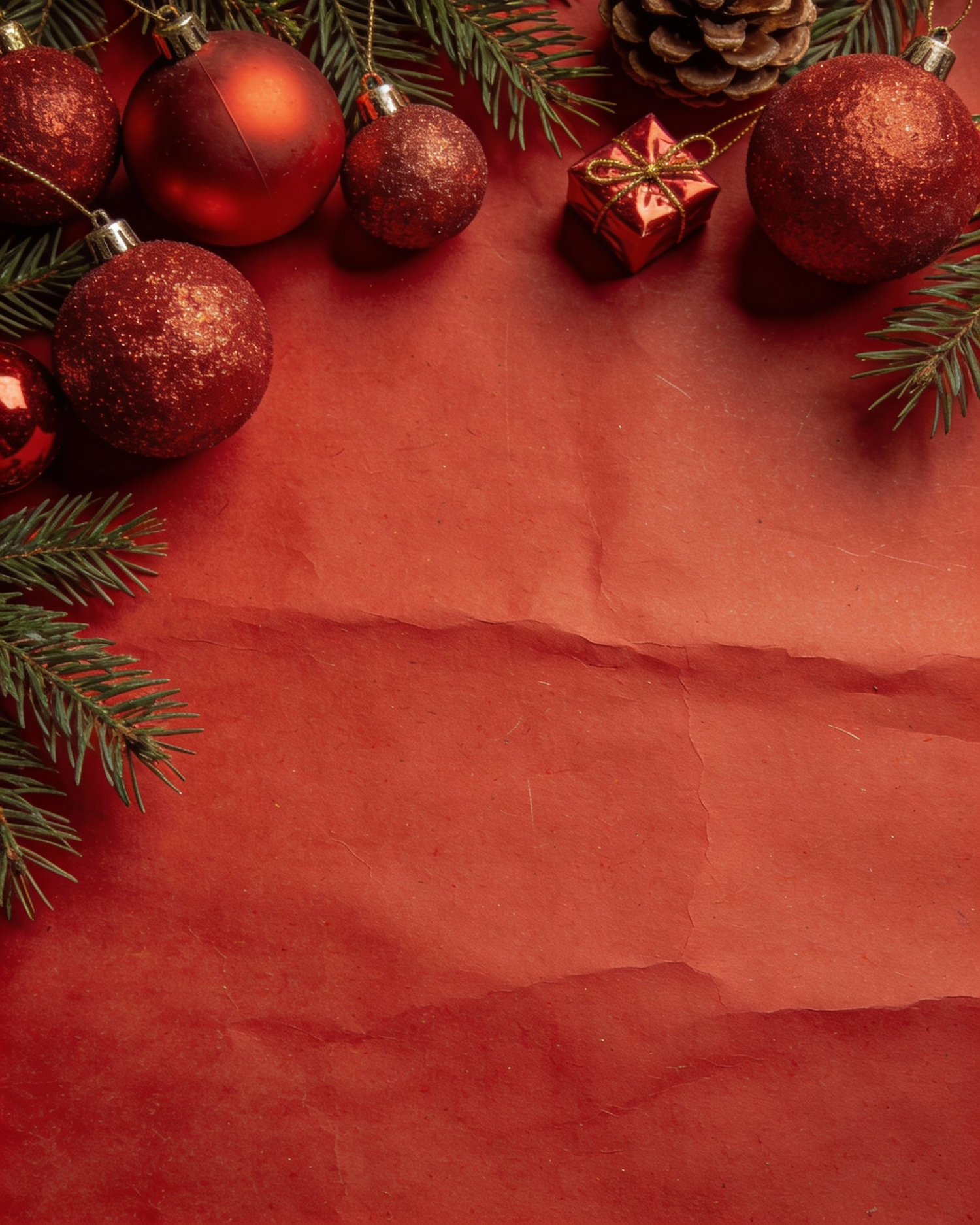 Festive red ornaments, pine branches, and a small gift on a textured red background create a warm holiday vibe.