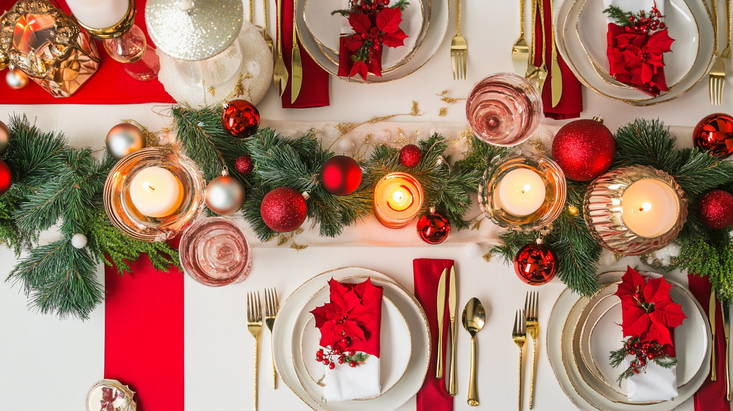 Elegant Christmas table setting with red, green, and gold decor, featuring candles, baubles, and poinsettias for a festive ambiance.