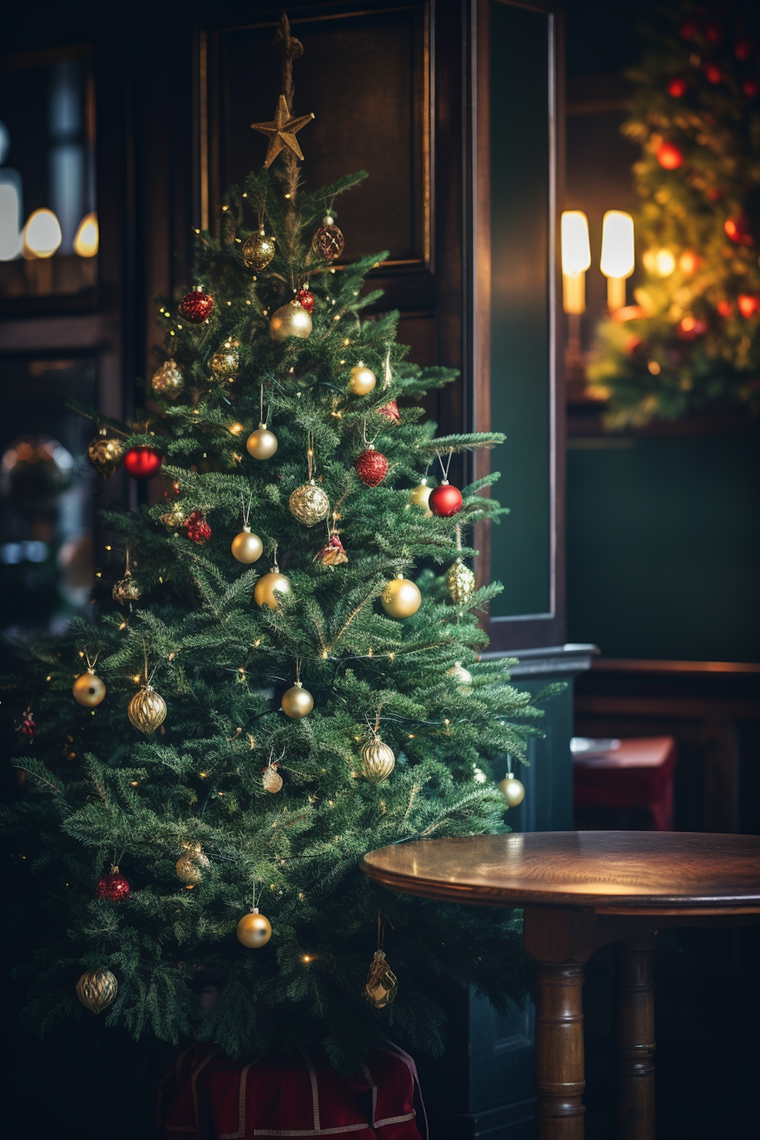 Elegant Christmas tree with gold and red ornaments in a cozy, warmly lit room with dark wood paneling and a small wooden table.