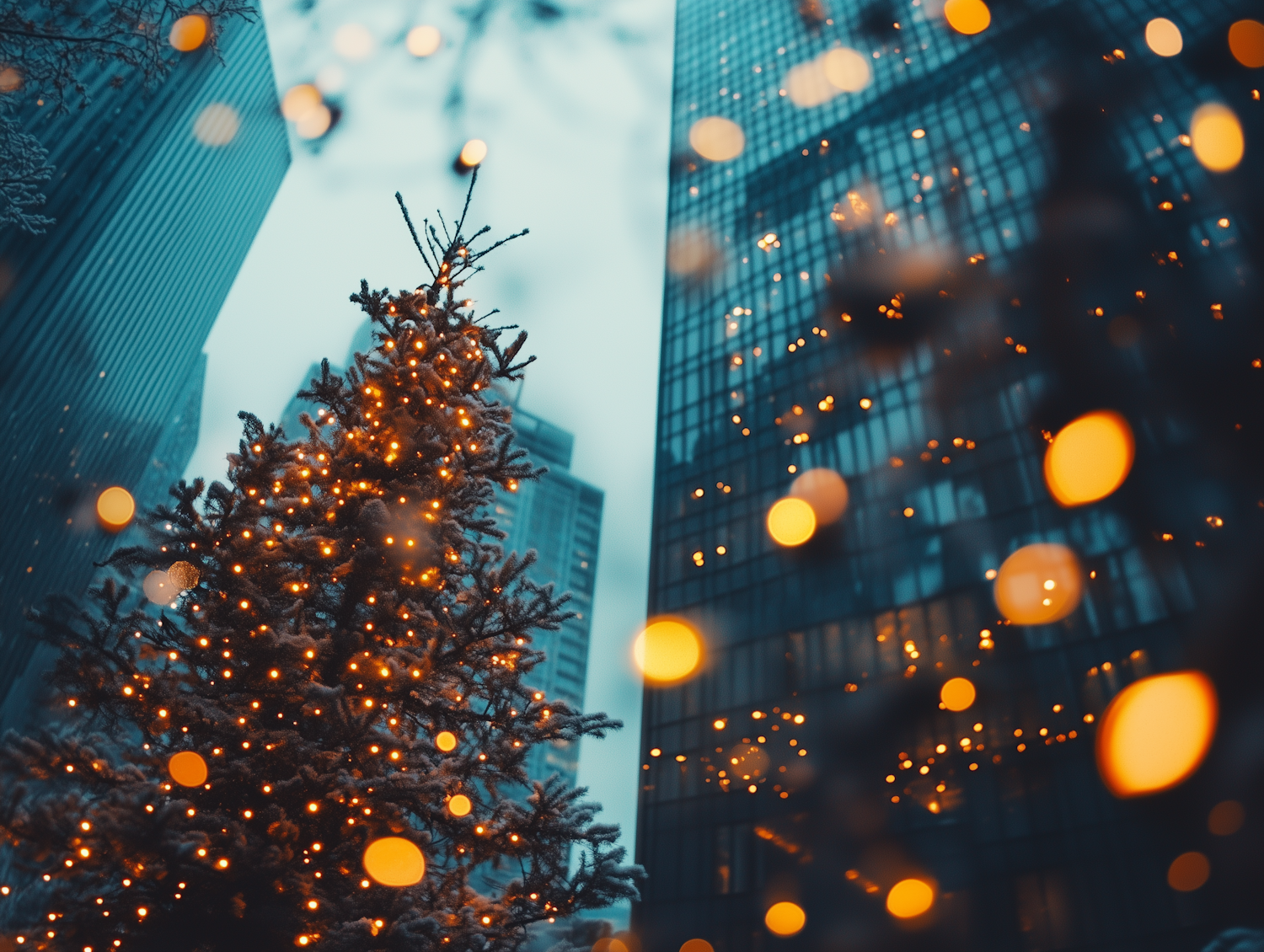 Festive Christmas tree with glowing lights in a snowy urban setting, surrounded by skyscrapers and a magical bokeh effect.