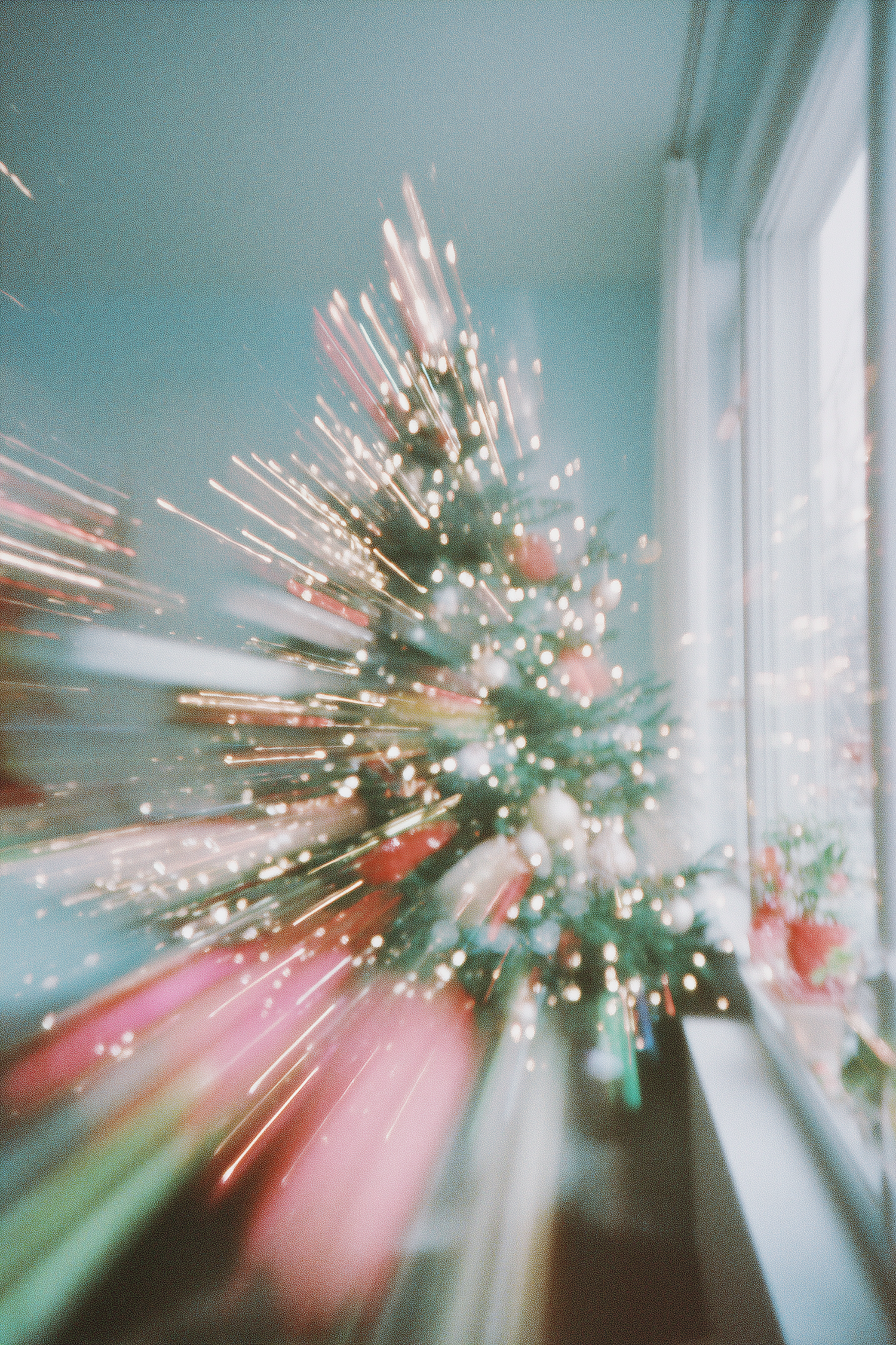 A festive Christmas tree with ornaments and lights, captured with a zoom blur effect for a dynamic holiday atmosphere.