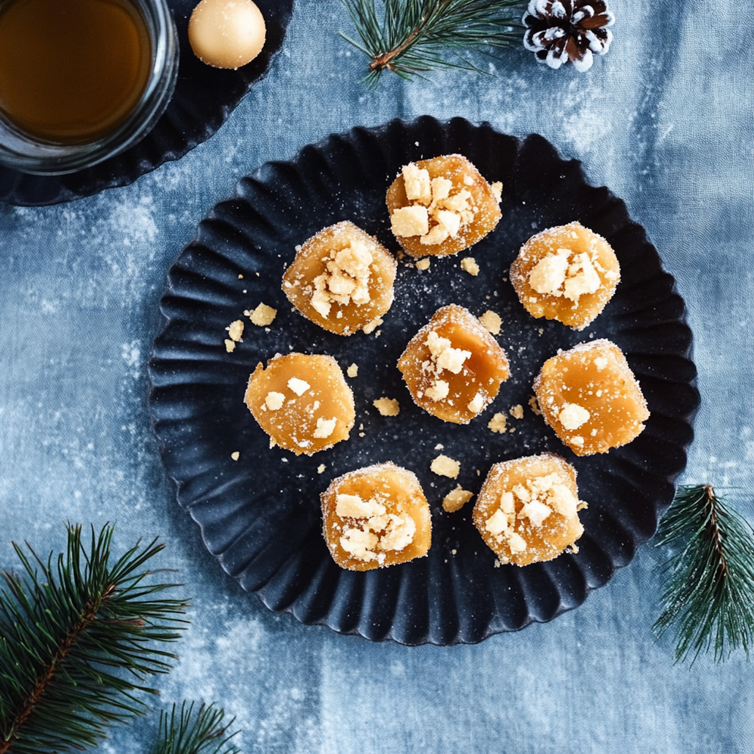 Elegant caramel confections on a black plate with festive evergreen sprigs and a glass of dark liquid on a blue background.