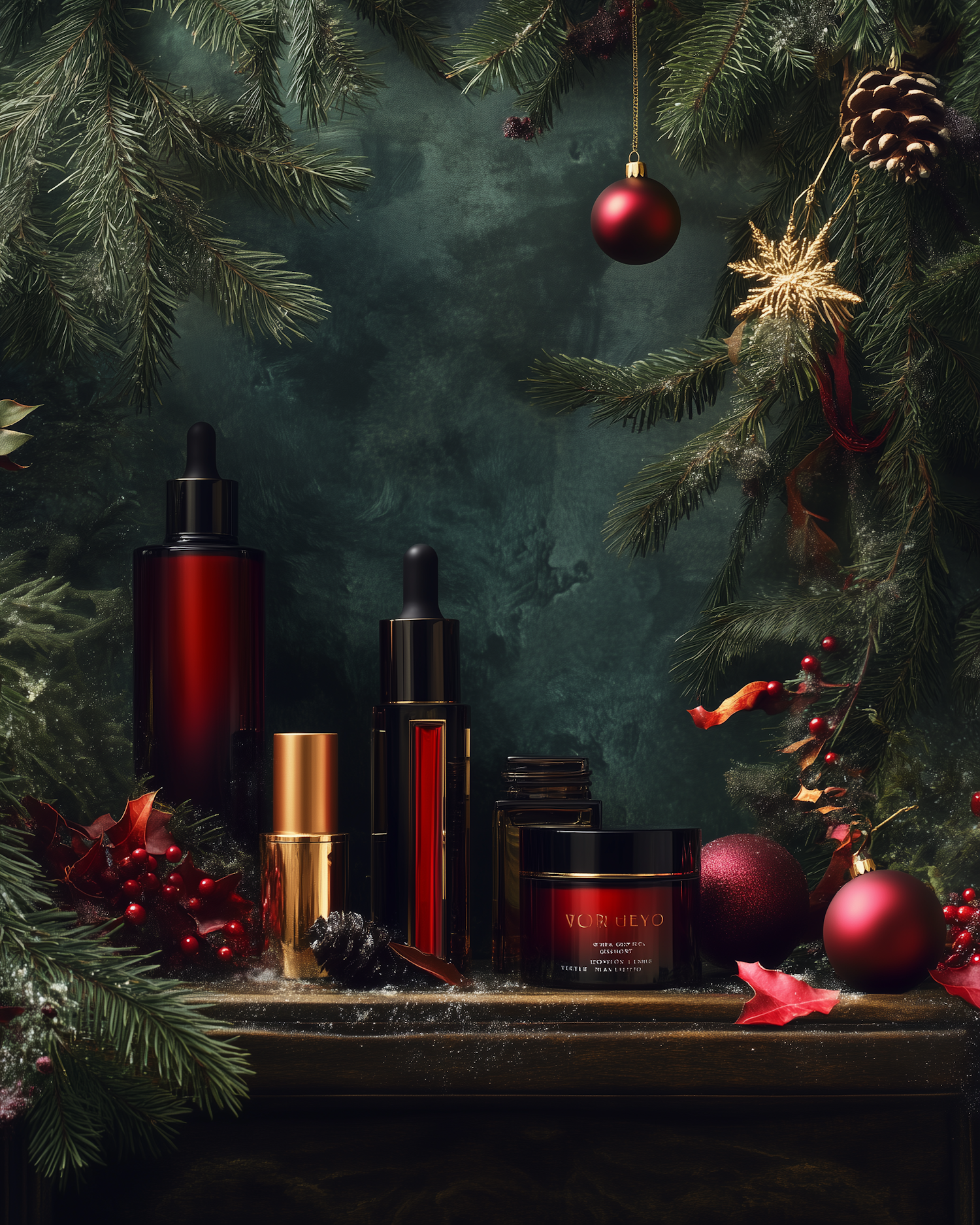 Luxurious skincare products in red and gold amidst festive pine branches and holiday ornaments, exuding elegance and holiday cheer.