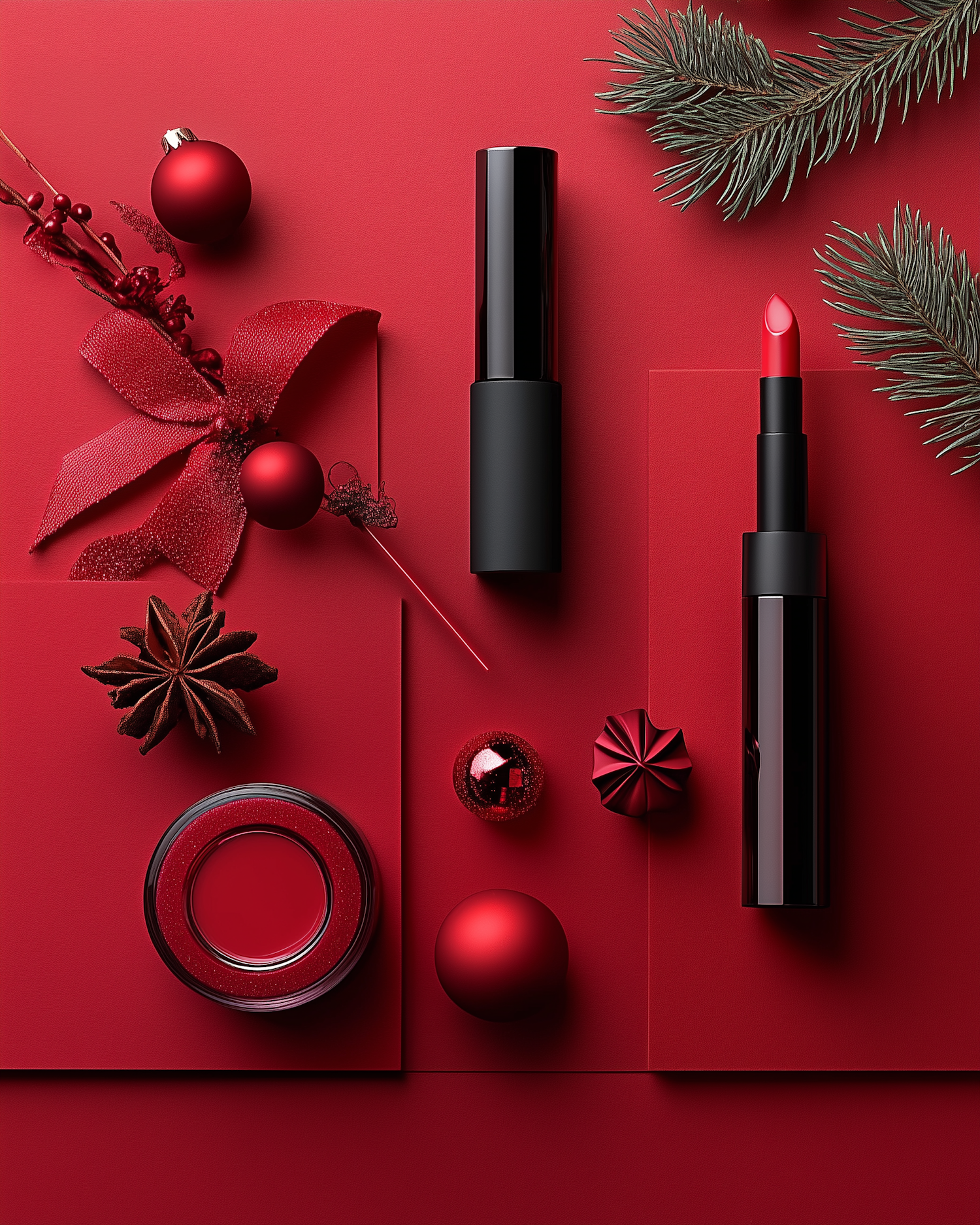 Festive red-themed arrangement with lipstick, ornaments, and evergreen sprigs on a rich red background.