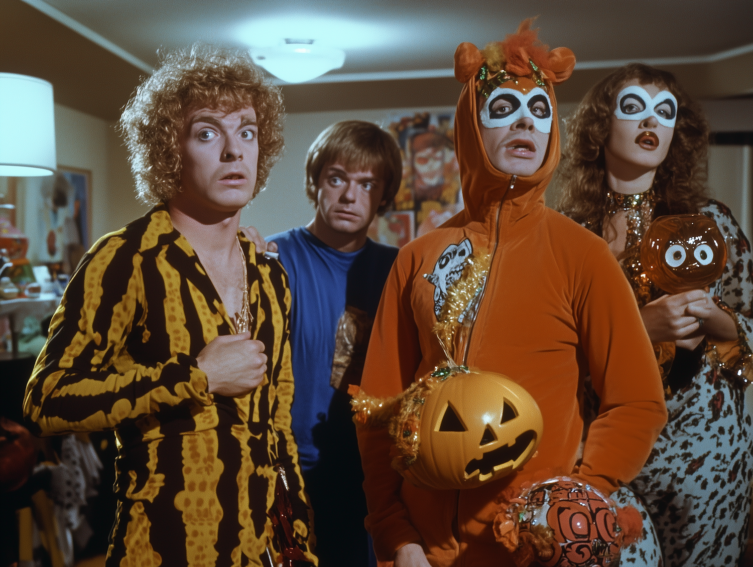 Four people in colorful costumes, including stripes and animal prints, hold pumpkin containers in a warmly lit room.