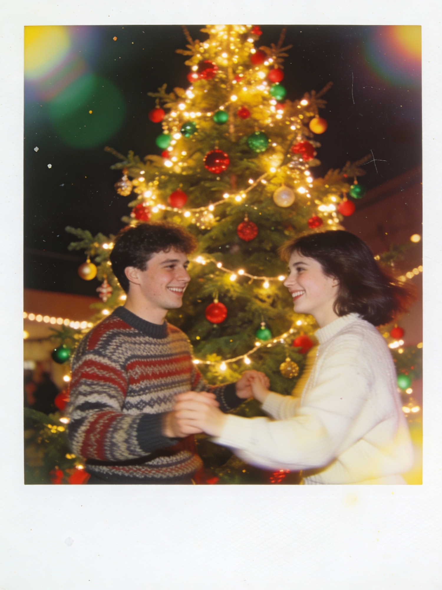 A candid 1987 consumer 35mm snapshot in color, taken in a cozy living room. A large, glowing Christmas tree fills the background with warm tungsten light, classic ornaments and string lights. A young couple does a small one-step twirl near the tree (not fast), smiling naturally, candid and unposed. Faces remain clear, minimal blur only in hands and lower clothing edges. Cozy vintage knit sweaters, timeless festive warmth. Not cinematic, not modern, not HDR. Scanned drugstore print look: slightly faded colors, yellowed whites, imperfect white balance with mild red/green cast, soft focus (not ultra-sharp), strong halation/bloom around the tree lights, visible 35mm grain, light vignette and corner softness, tiny dust specks and faint print scratches.