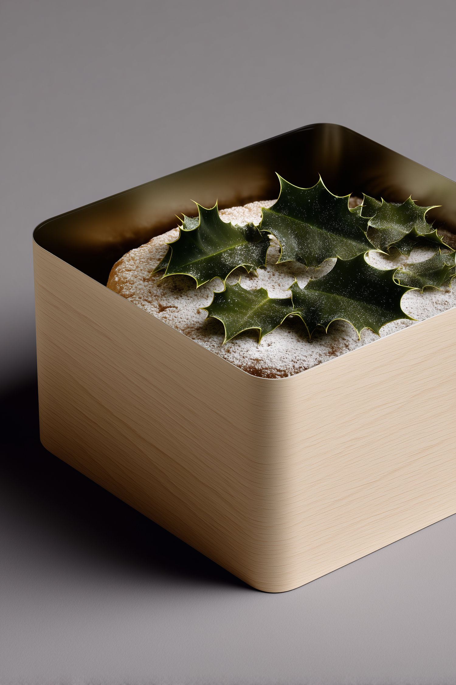 A wooden container holds a dessert topped with powdered sugar and holly leaves, creating a festive and elegant presentation.