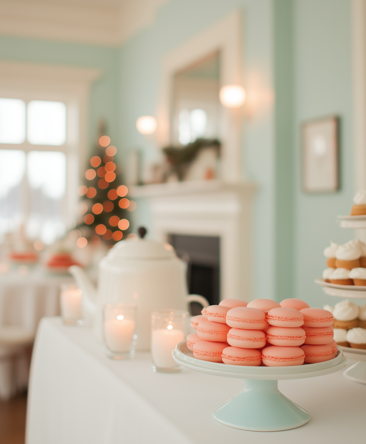 Elegant dessert table with pink macarons, white teapot, and candles in a pastel-themed room with a festive Christmas tree.
