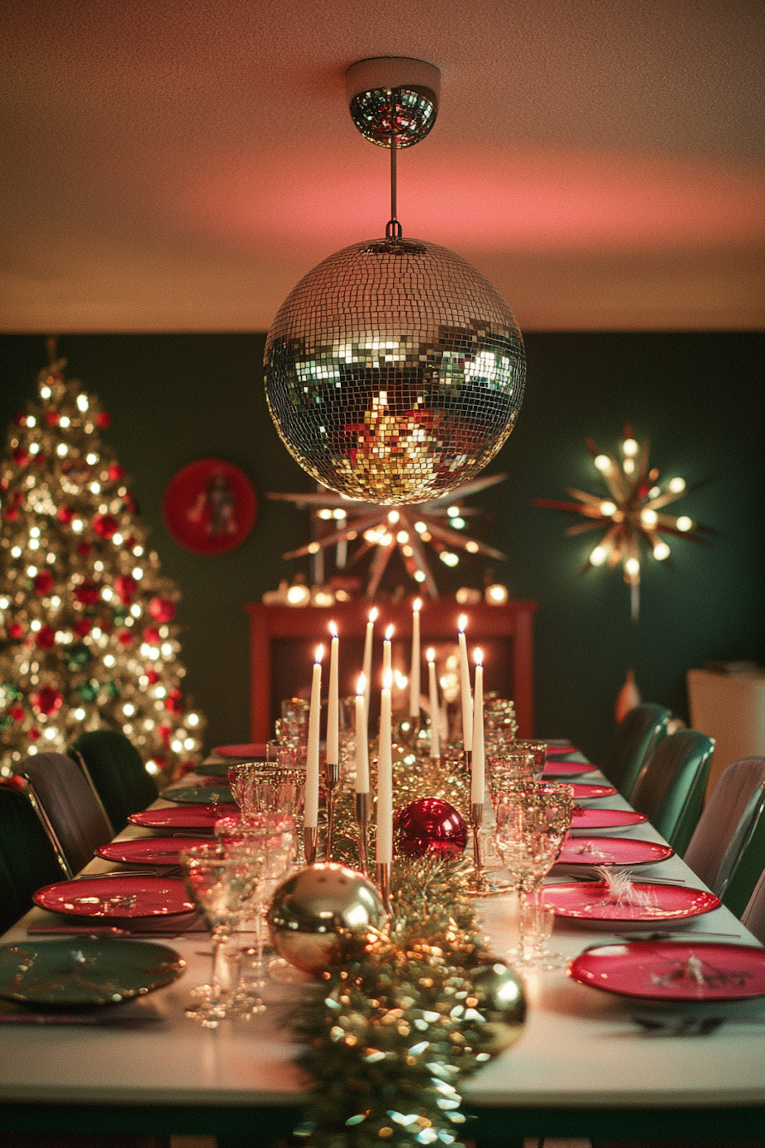 Festive dining room with disco ball, elegant table setting, and glowing Christmas tree, creating a warm holiday atmosphere.