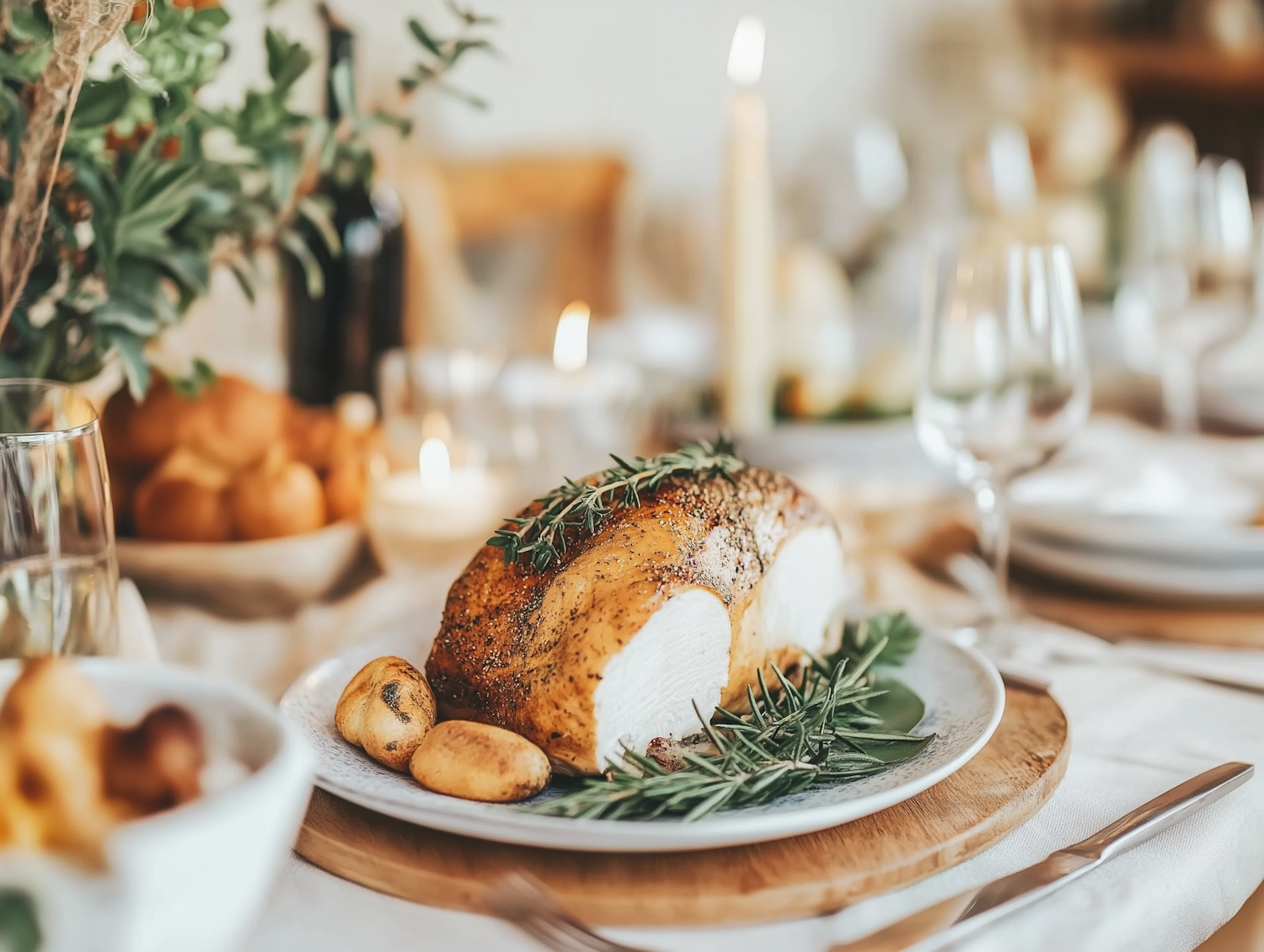 Elegant dining table with roasted turkey breast, rosemary, and potatoes, set with wine glasses and candles for a festive meal.