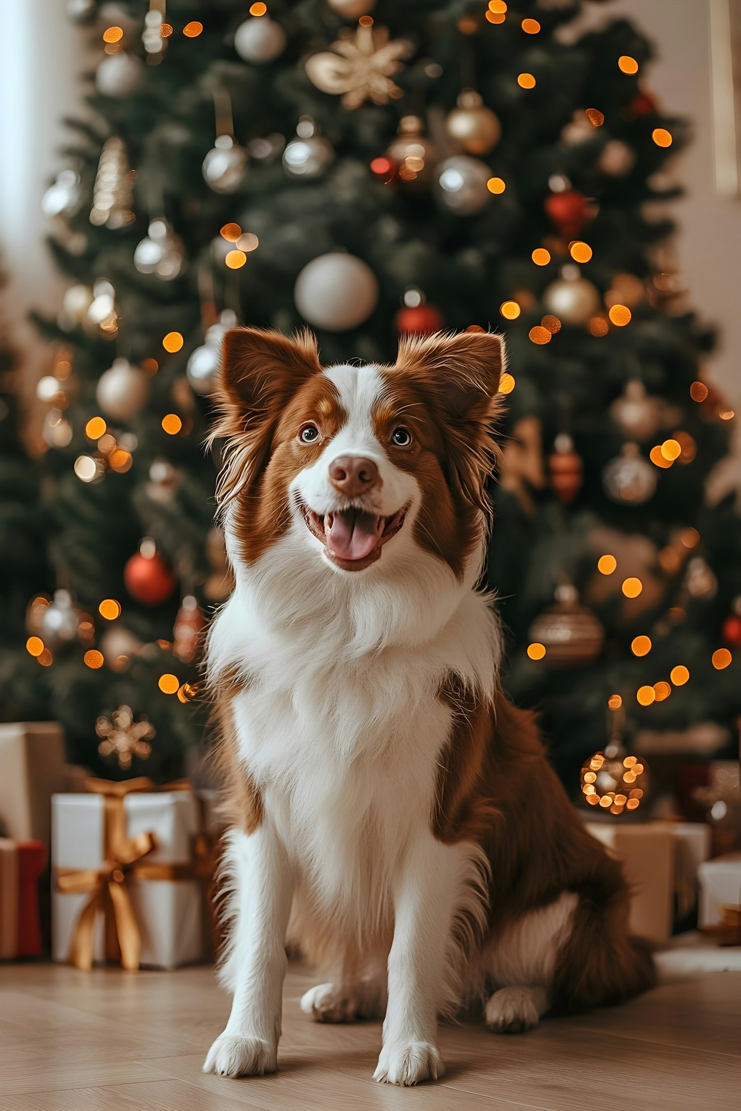 Cheerful dog in front of a decorated Christmas tree with ornaments and presents, capturing a festive holiday spirit.