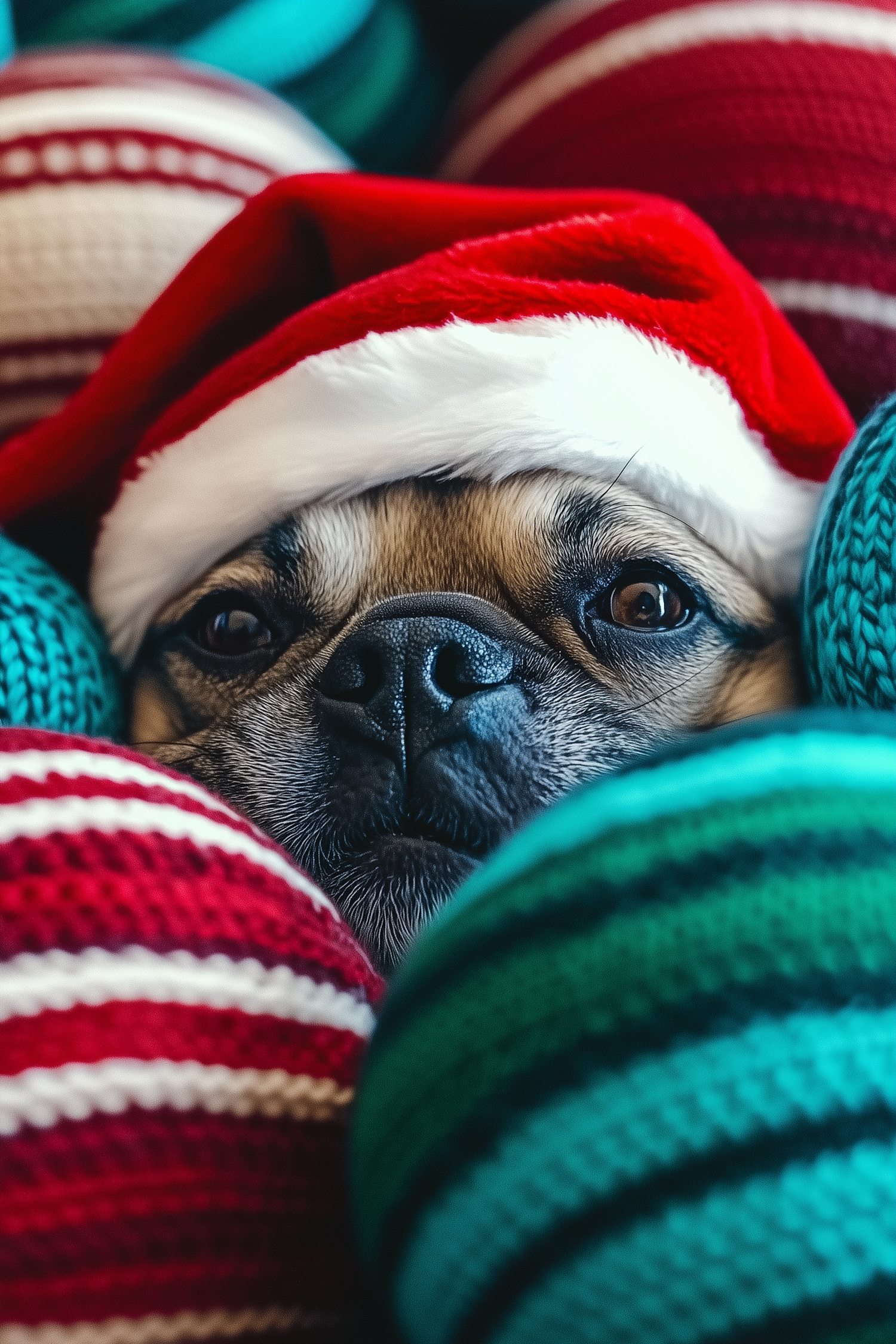 Adorable dog in a Santa hat nestled among colorful knitted blankets, creating a cozy holiday vibe.
