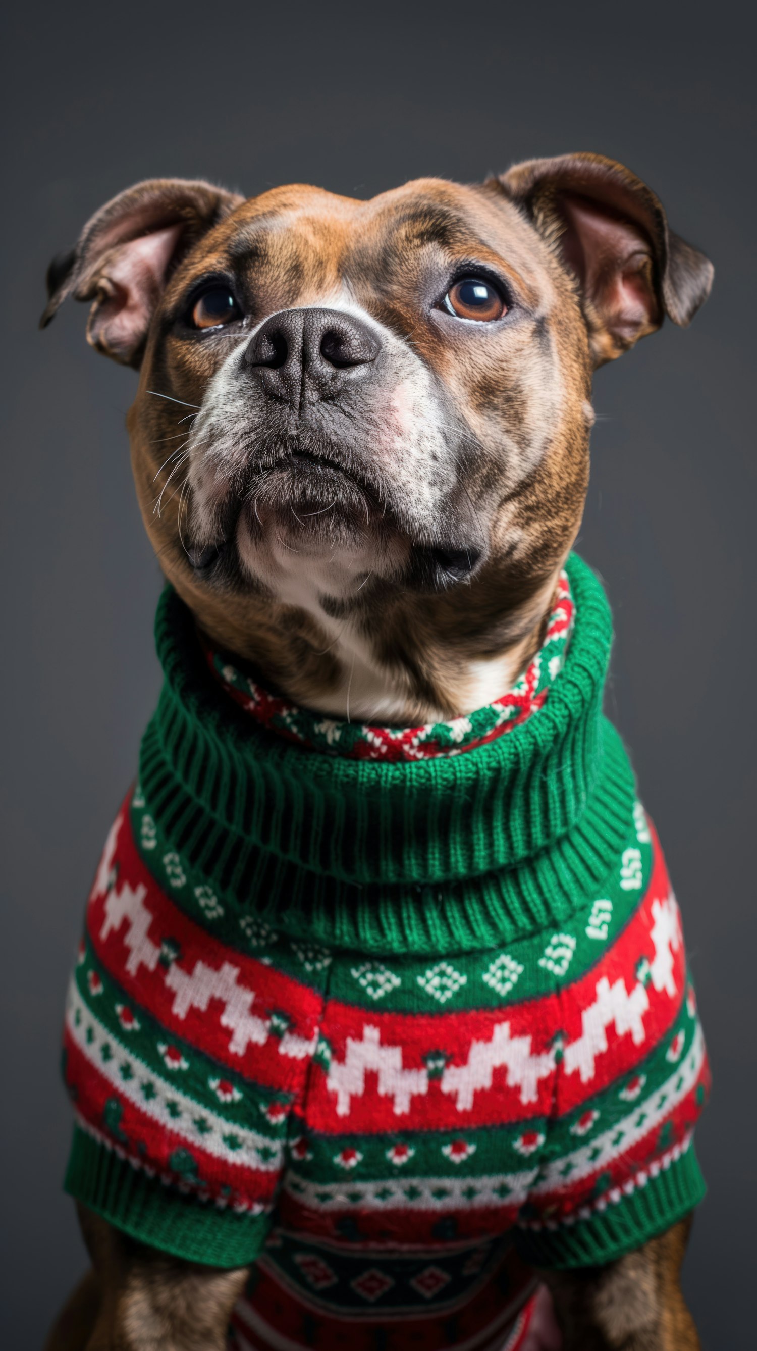 Adorable brindle dog in a festive green and red sweater with reindeer patterns, set against a neutral gray background.