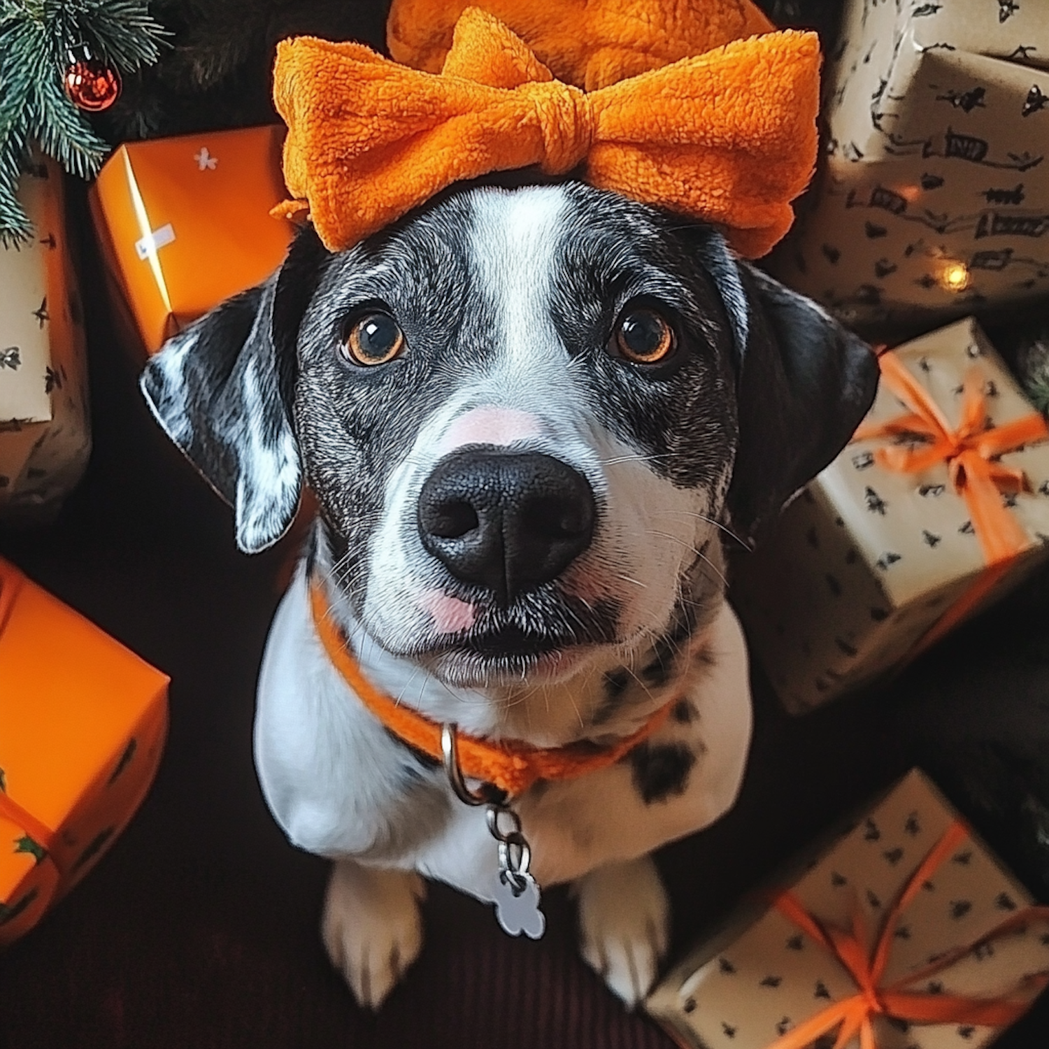 Adorable black and white dog with an orange bow surrounded by festive gifts and holiday decor.