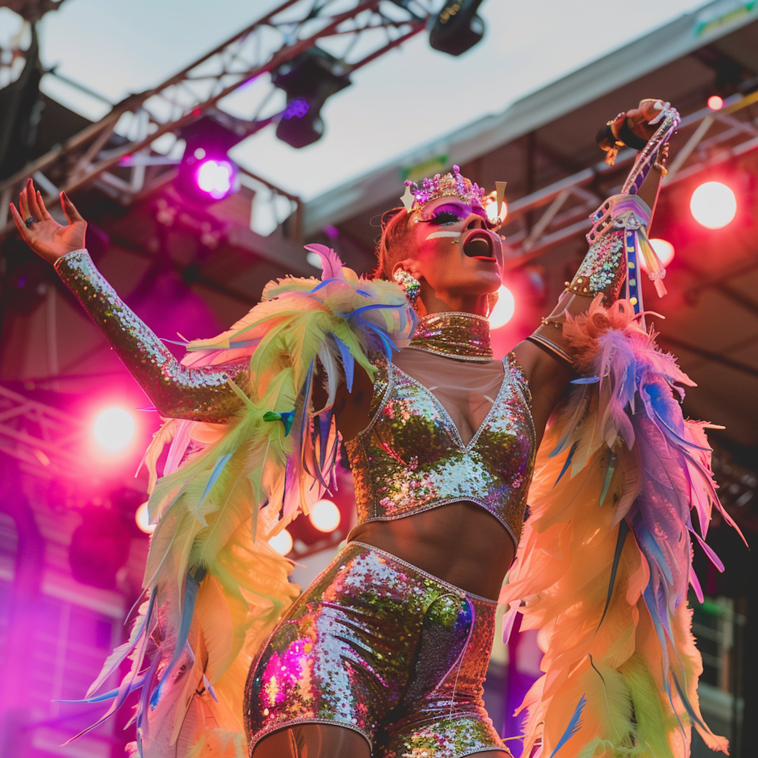 Vibrant performer in sequined outfit with colorful feathers, exuding energy on a brightly lit stage.