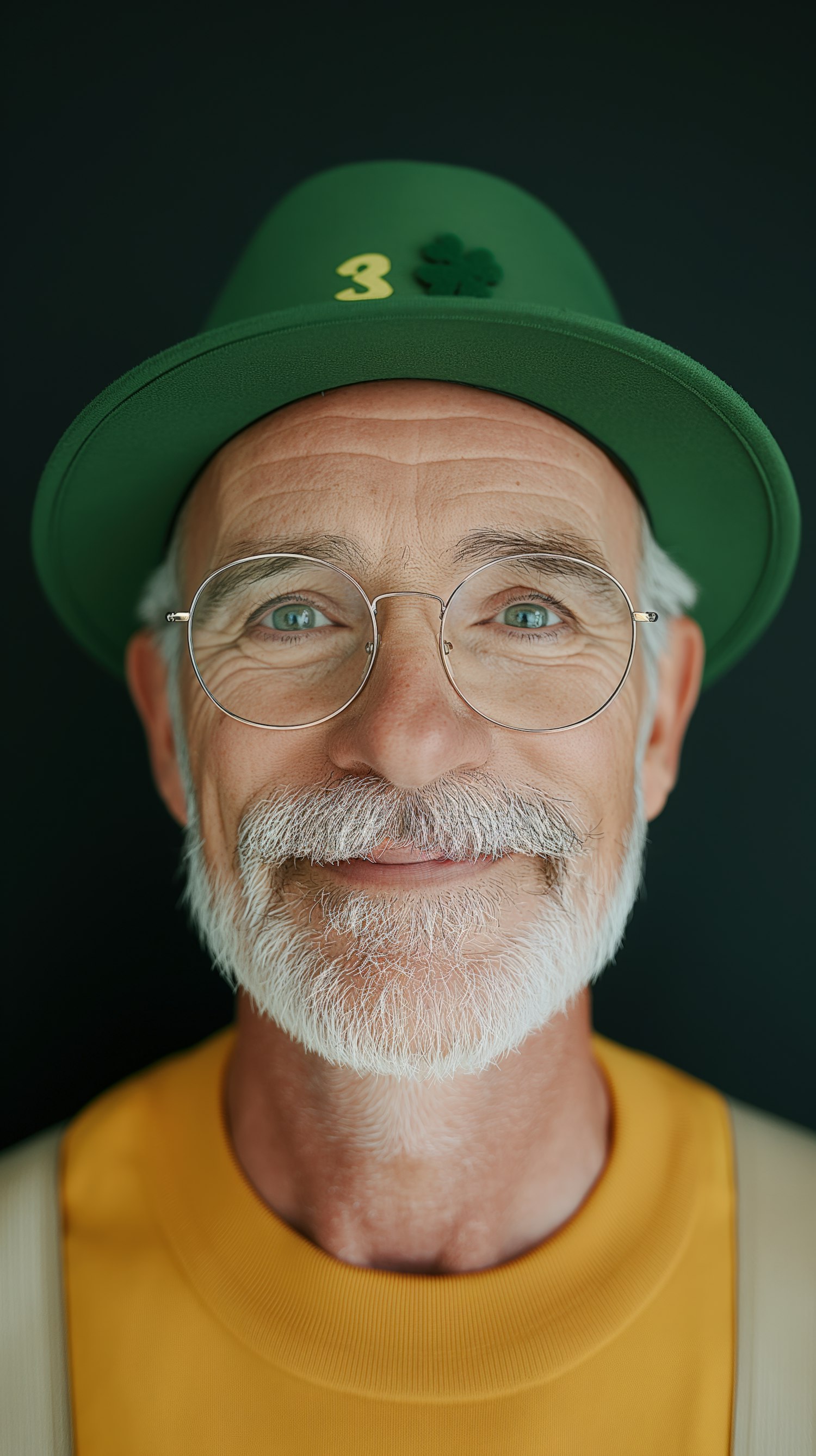 Smiling elderly man with a green hat featuring a clover and '3', wearing glasses and a yellow shirt, against a dark green background.