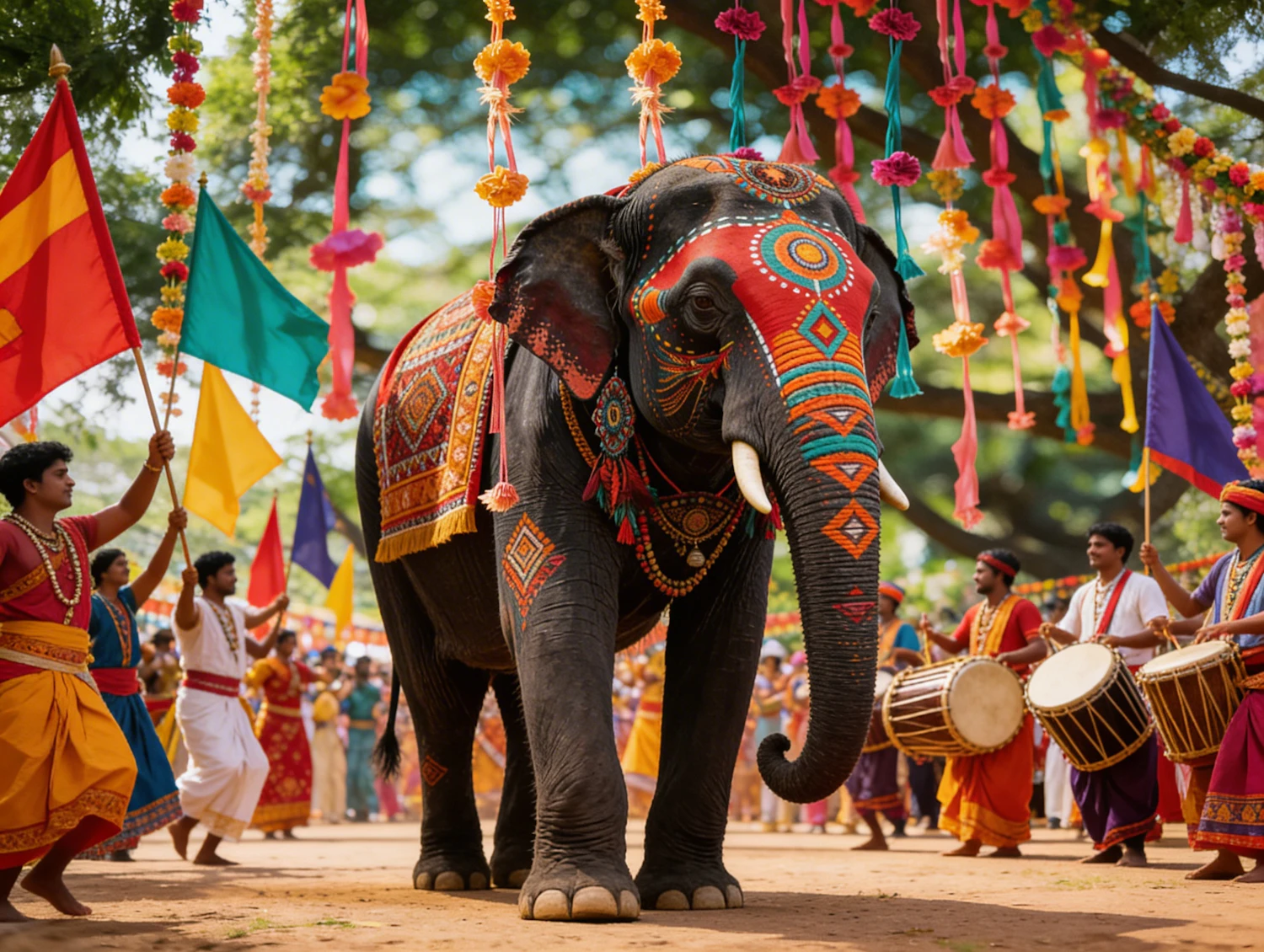 A beautifully adorned elephant leads a vibrant festival procession with participants in traditional attire, flags, and drums.