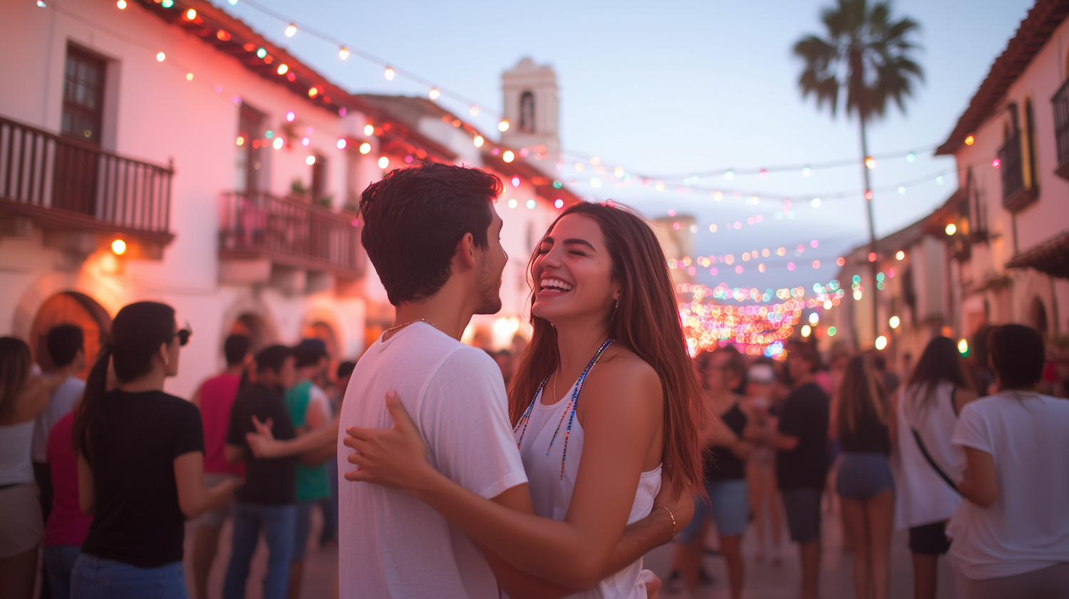 A joyful couple dances under colorful lights in a festive street scene, surrounded by people and charming architecture.