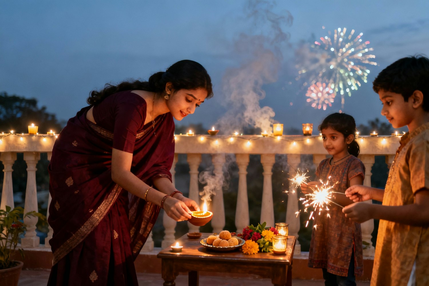 A warm evening scene of a family celebrating Diwali on the terrace of their home, surrounded by the gentle glow of dozens of diyas flickering in clay bowls. The air is soft with the haze of incense and the faint sparkle of distant fireworks. A young woman in a deep maroon saree bends to light another lamp while children nearby hold sparklers, their faces lit with excitement and gold reflections dancing in their eyes. Behind them, strings of fairy lights trace the outline of the balcony, and a plate of sweets and flowers rests on a low wooden table. The lighting feels natural and intimate — a mix of candlelight and the cool night sky — with the photo captured at eye level, slightly off-center, as if taken by a friend pausing mid-laughter to preserve a fleeting, joyful moment