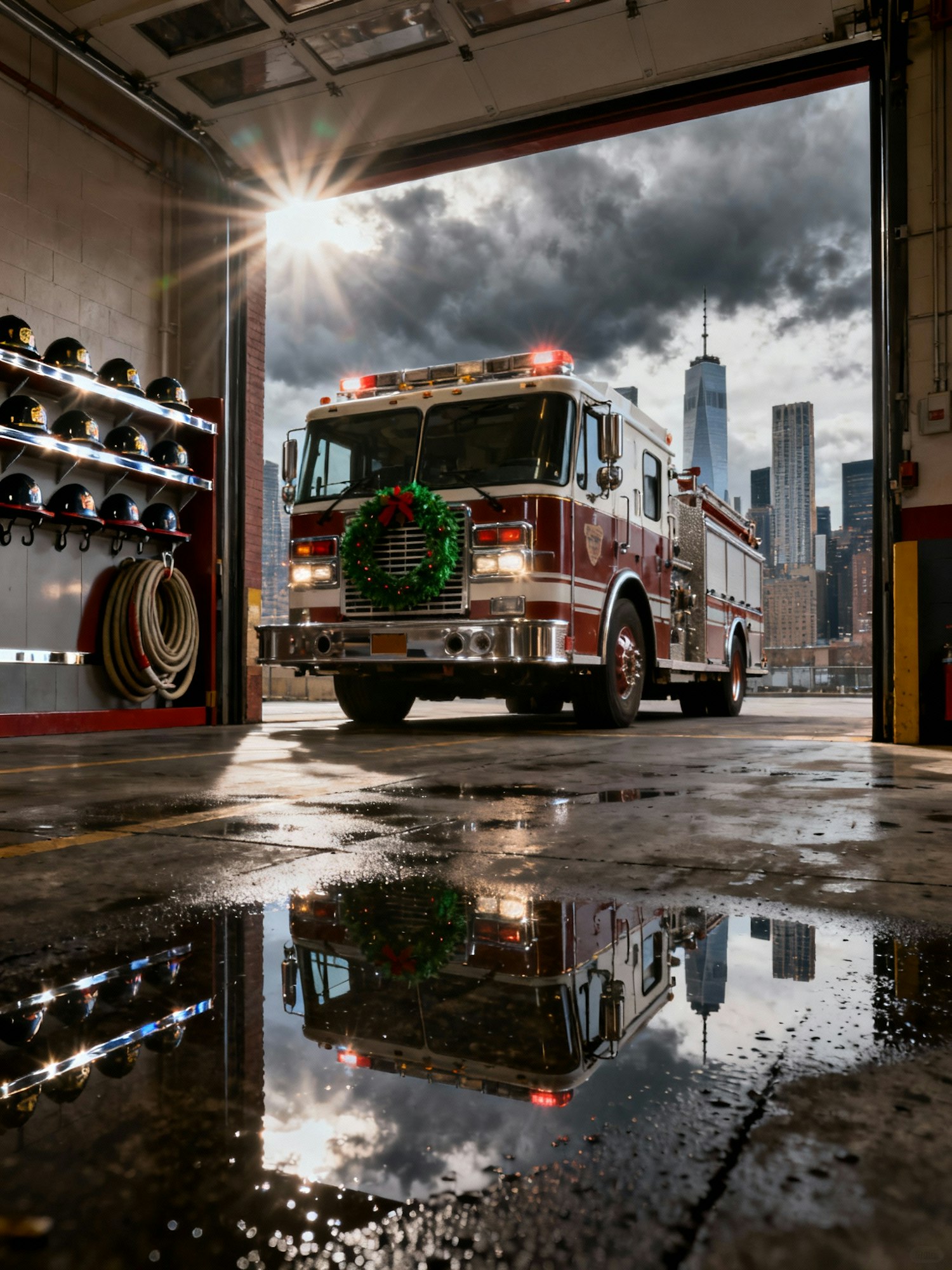A fire truck with a holiday wreath is parked in a fire station, reflecting in a puddle, with a city skyline and dramatic clouds in the background.