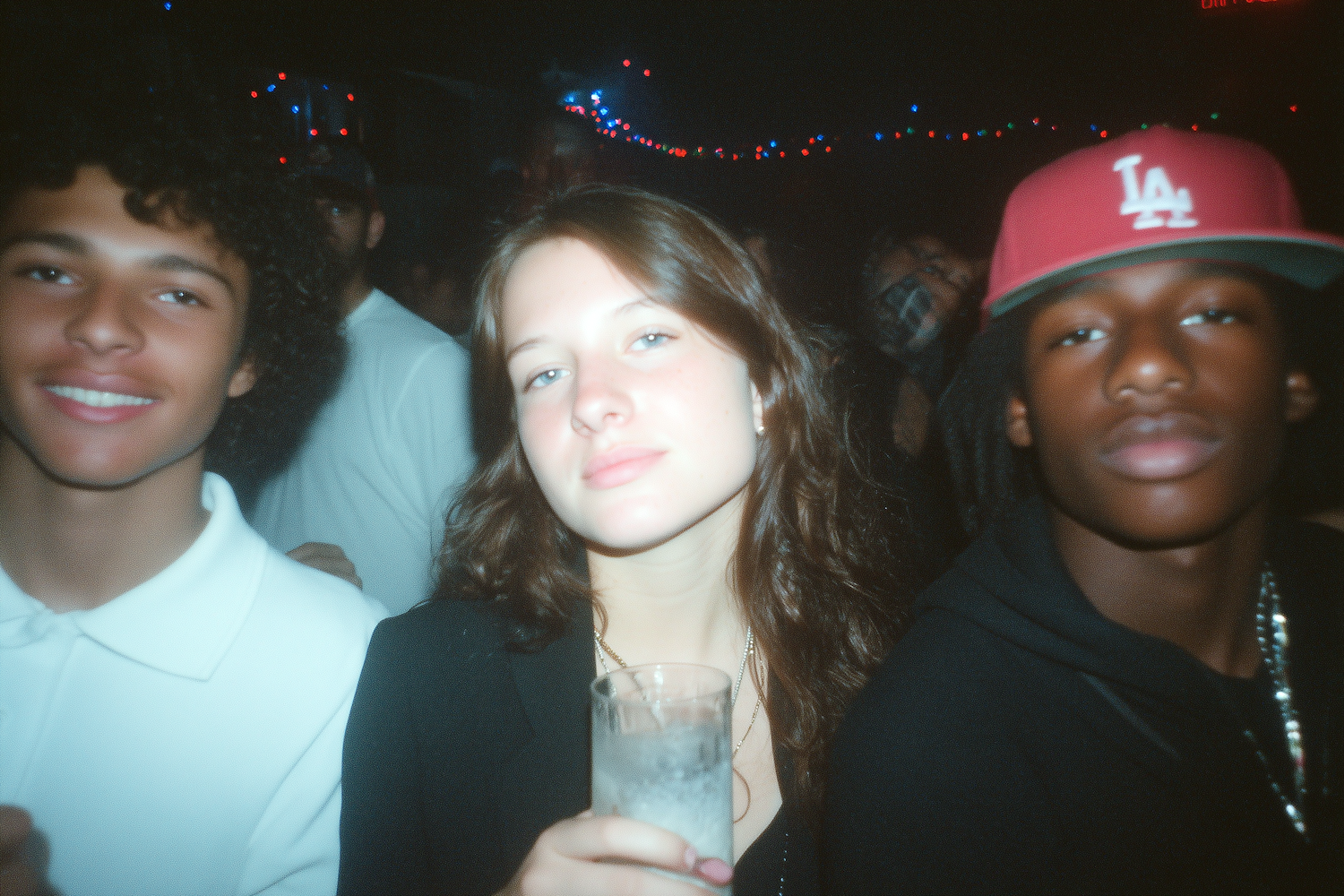 Three friends at a party, enjoying the moment with colorful lights in the background.