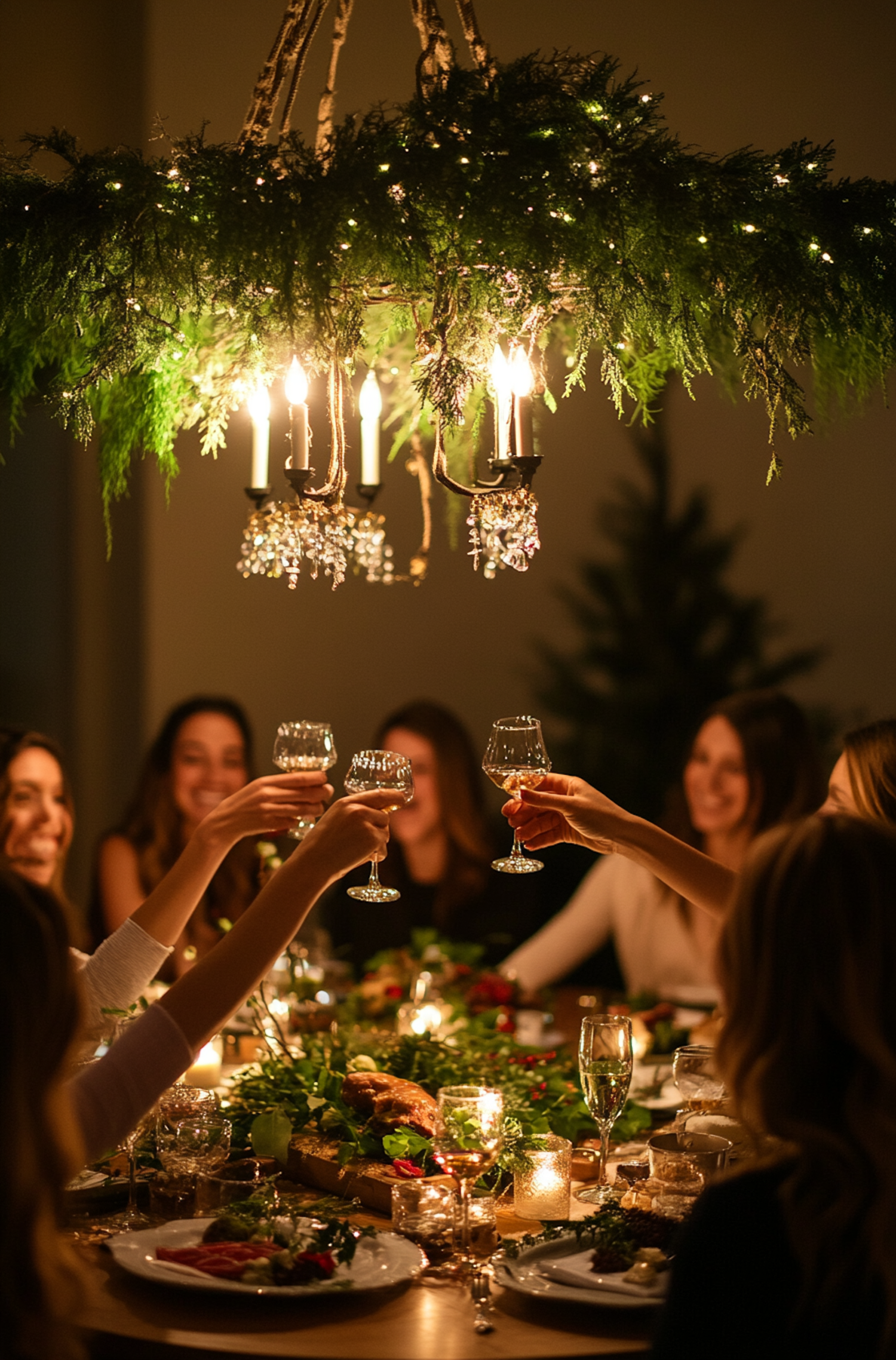 Festive dinner scene with friends toasting under a greenery-adorned chandelier, creating a warm and joyful atmosphere.