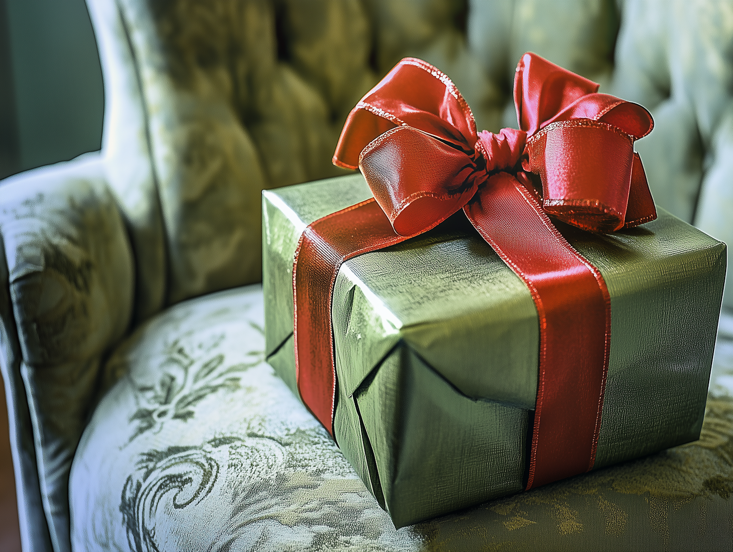 Elegant green gift box with a red bow on a vintage floral armchair, creating a festive and cozy holiday ambiance.