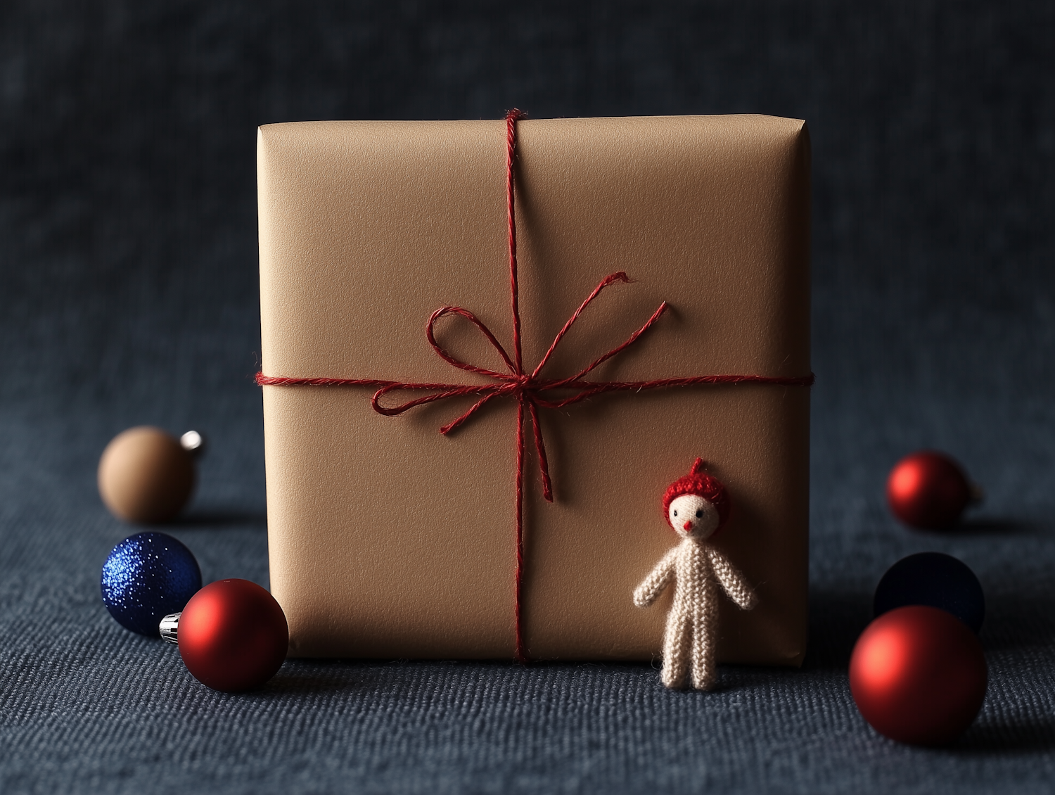 A brown paper-wrapped gift with red string, surrounded by colorful ornaments and a small knitted doll on a dark fabric surface.