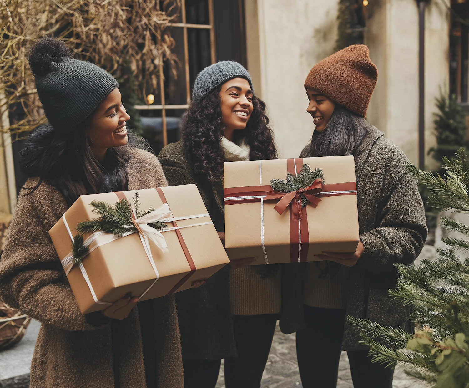 Three women in winter attire joyfully hold wrapped gifts outdoors, creating a festive holiday atmosphere with smiles and cozy coats.